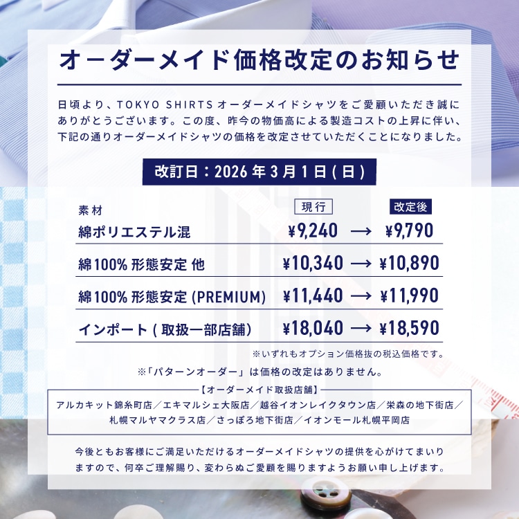 オーダーメイド価格改定のお知らせ