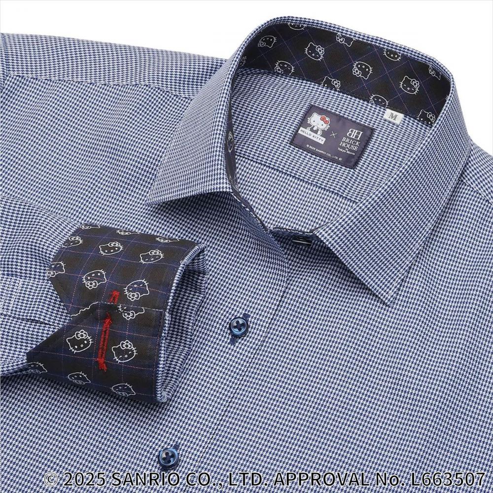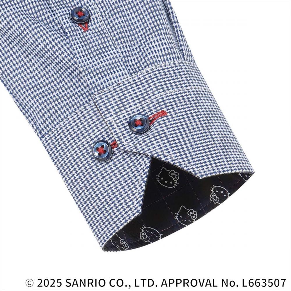 可愛らしいキティちゃんのデザインを ビジネスシーンに溶け込みやすい 別布やボタンの配色、ボタン糸で 表現した他にはないワイシャツ。