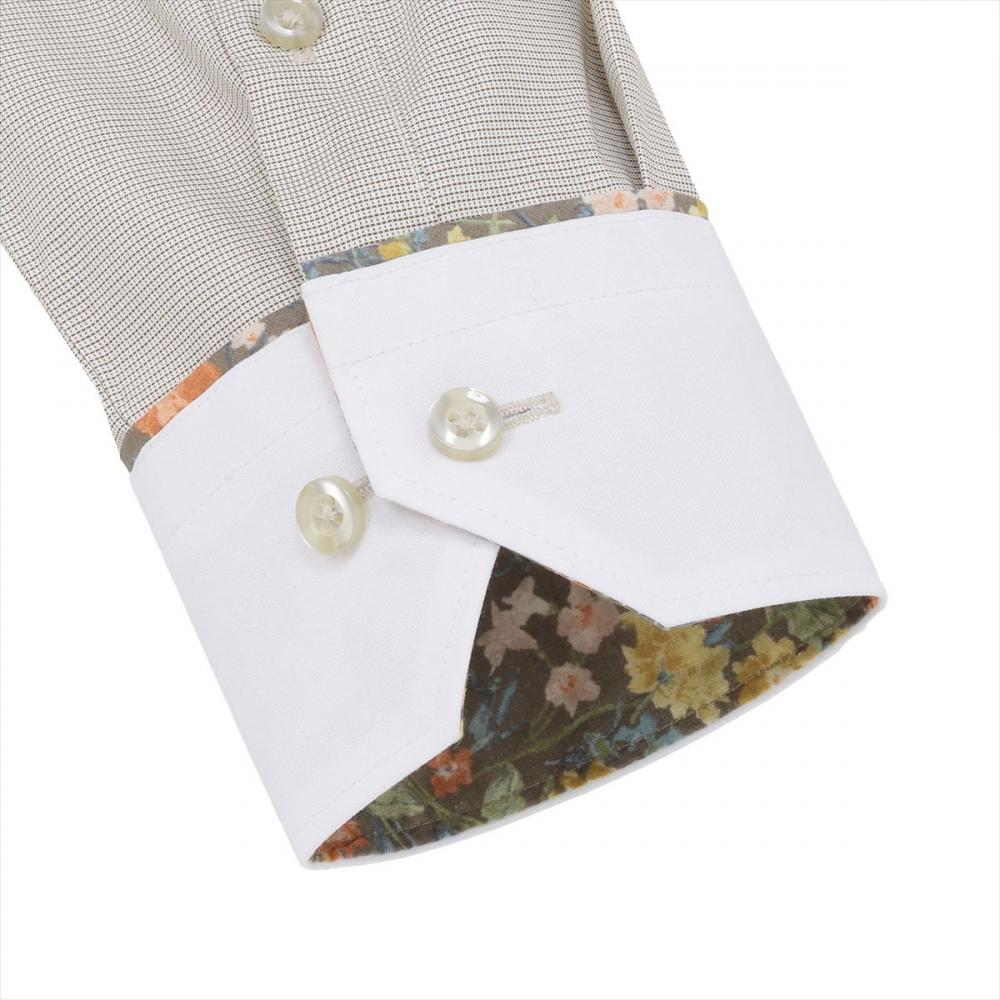 ポイント身生地の色味と合わせた華やかな花柄の 別生地がシャツスタイルに彩りを添えます。