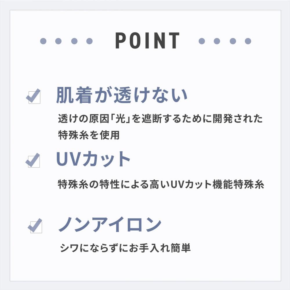 透け感軽減+UVカット生地でどんな 季節もお洒落な着こなしが楽しめます。