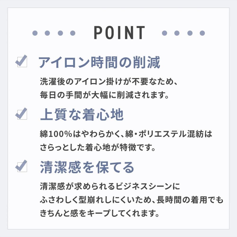 形態安定加工と綿×ポリエステル 素材で、クリーニング要らずの 自宅で取扱い楽ちんのワイシャツ。衿型 レギュラー衿 素材 ポリエステル65% 綿35%