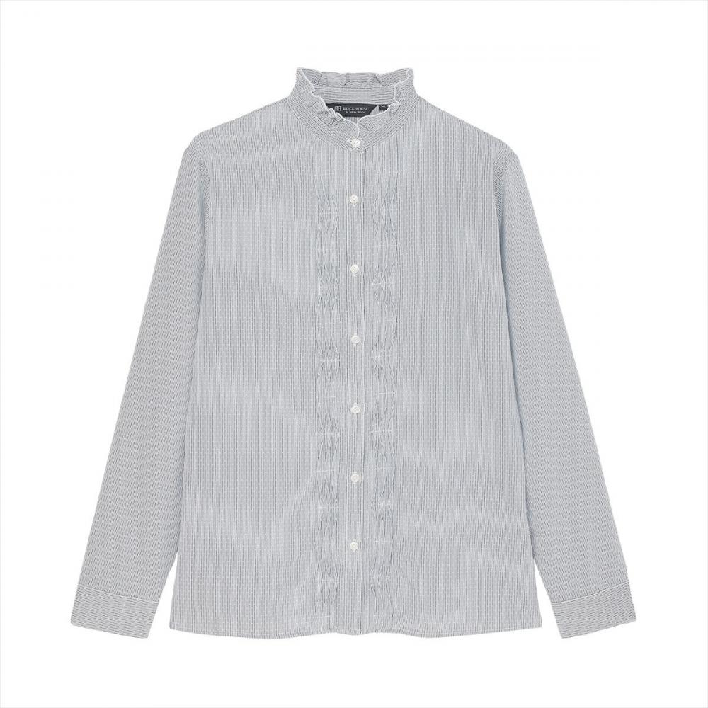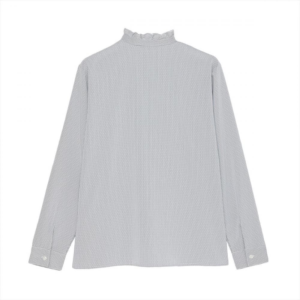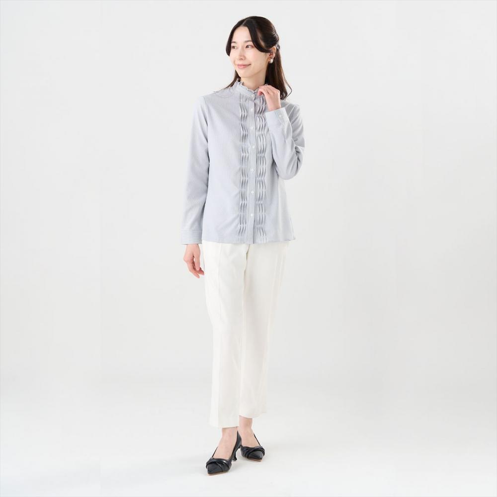 衿は可愛らしいフリルをあしらい 前身頃はひねりピンタック仕様で 華やかさを演出するデザイン。