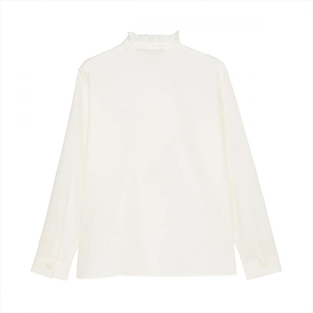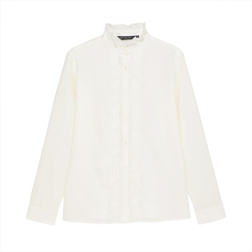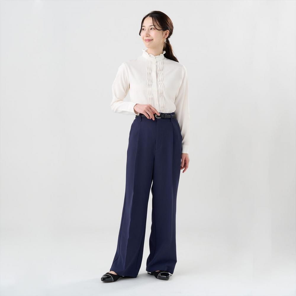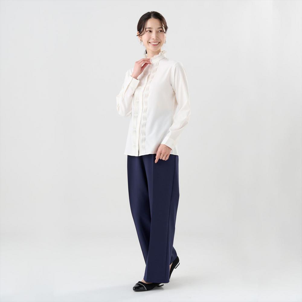 衿は可愛らしいフリルをあしらい 前身頃はひねりピンタック仕様で 華やかさを演出するデザイン。