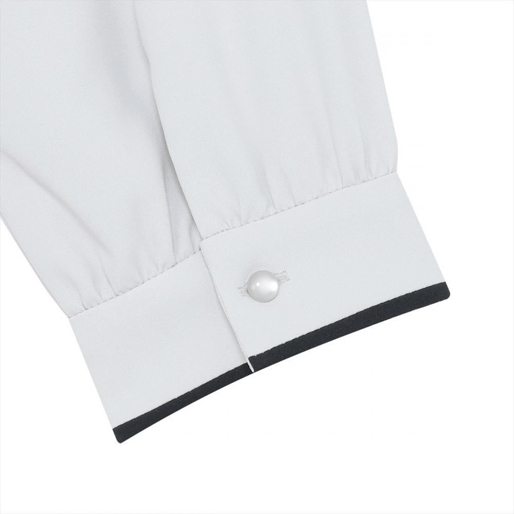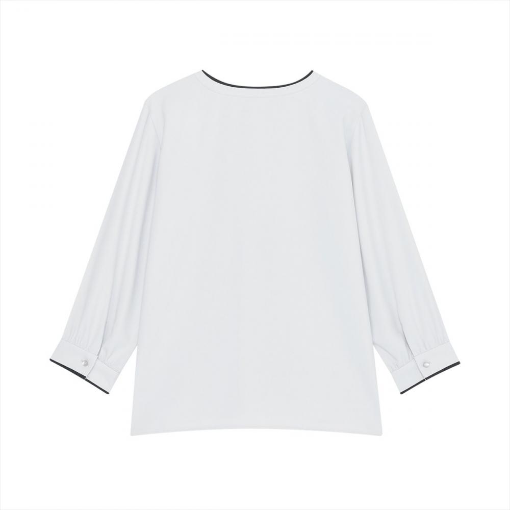 衿や袖回りのほか、タック部分にも 配色されてアクセントになるブラウス。