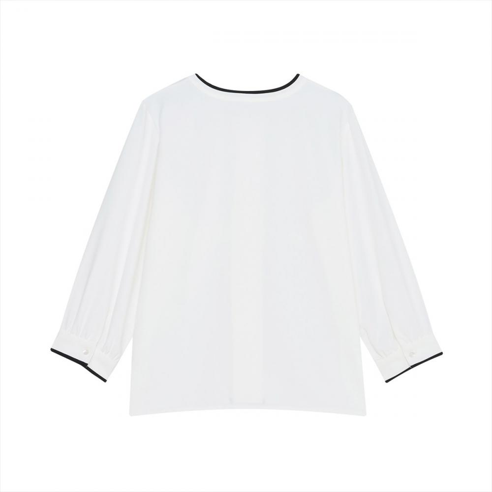 衿や袖回りのほか、タック部分にも 配色されてアクセントになるブラウス。