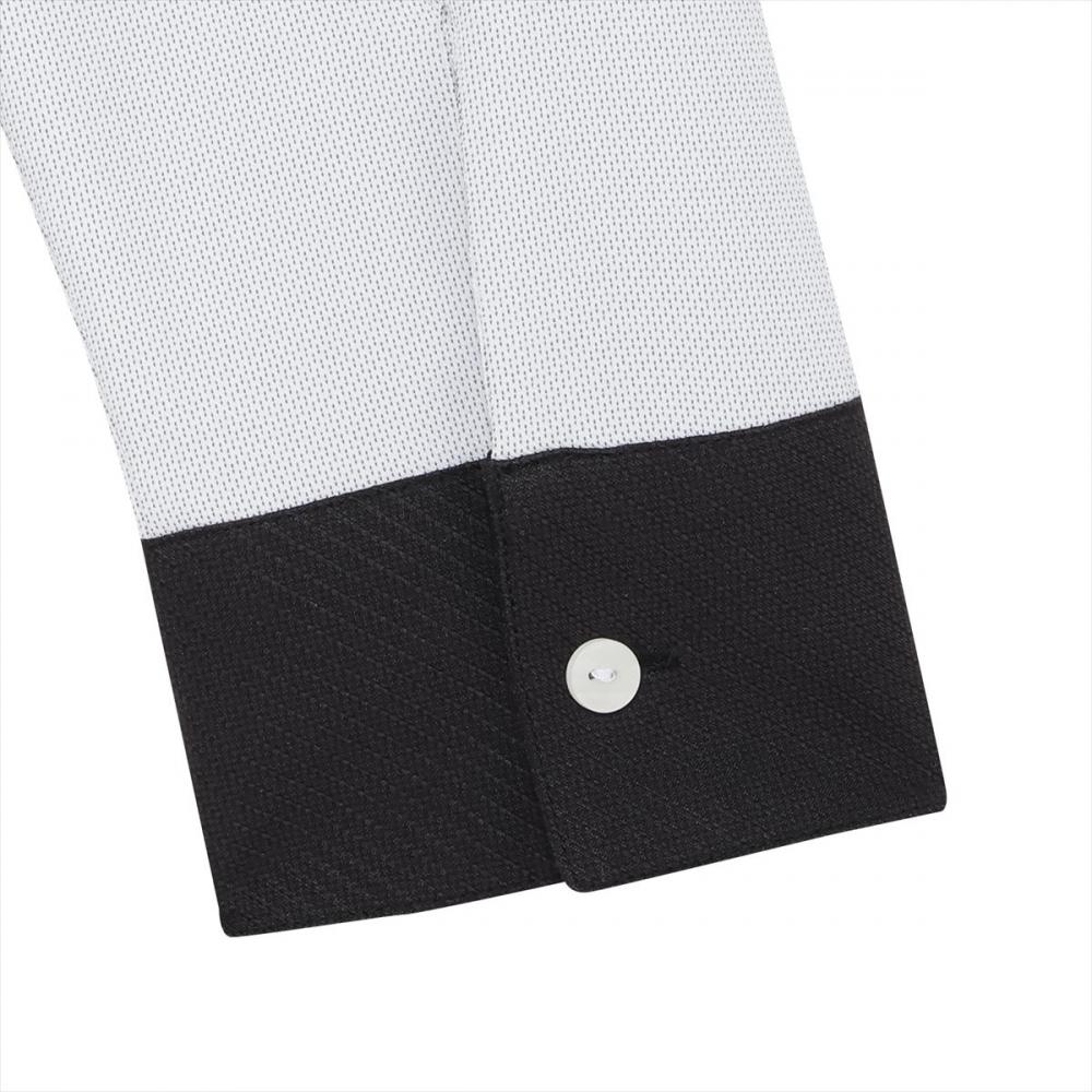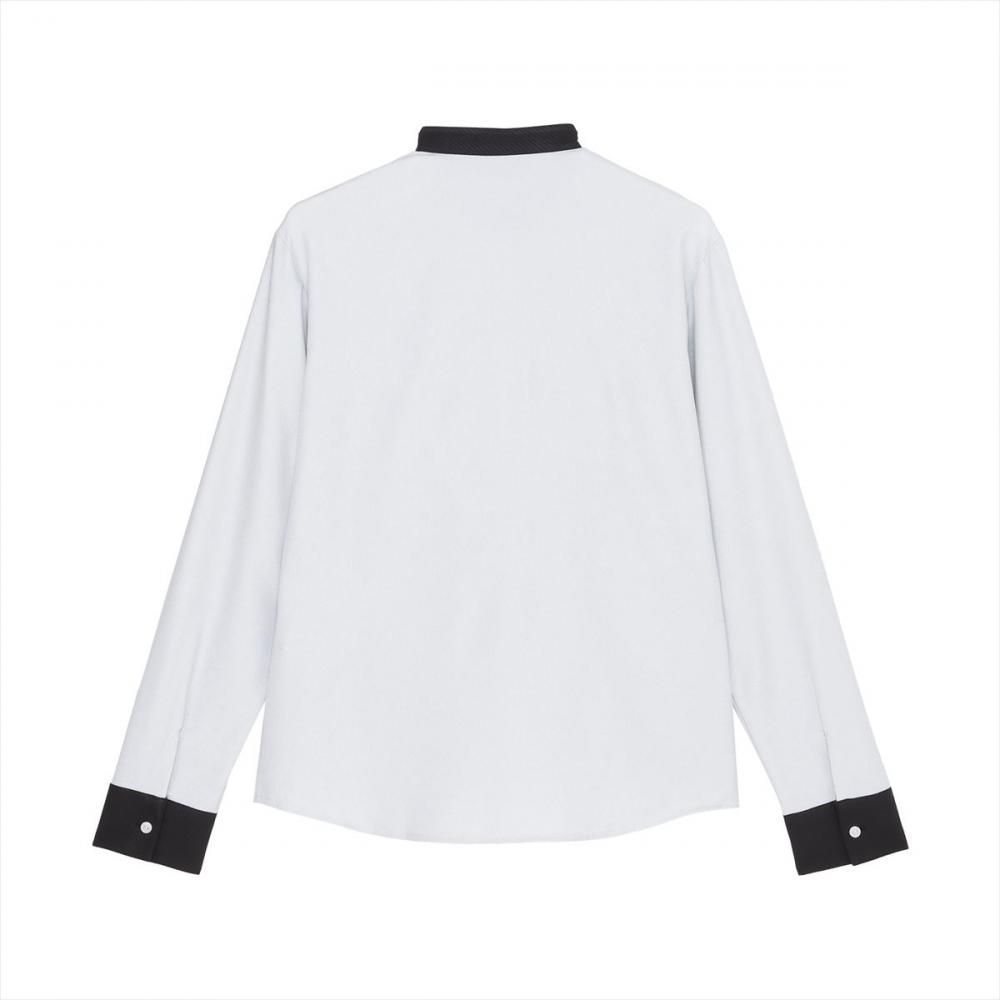 濃色の衿とカフスでキリっとした 印象になるスタンド衿シャツは ビジネススタイルにもおすすめな一枚。