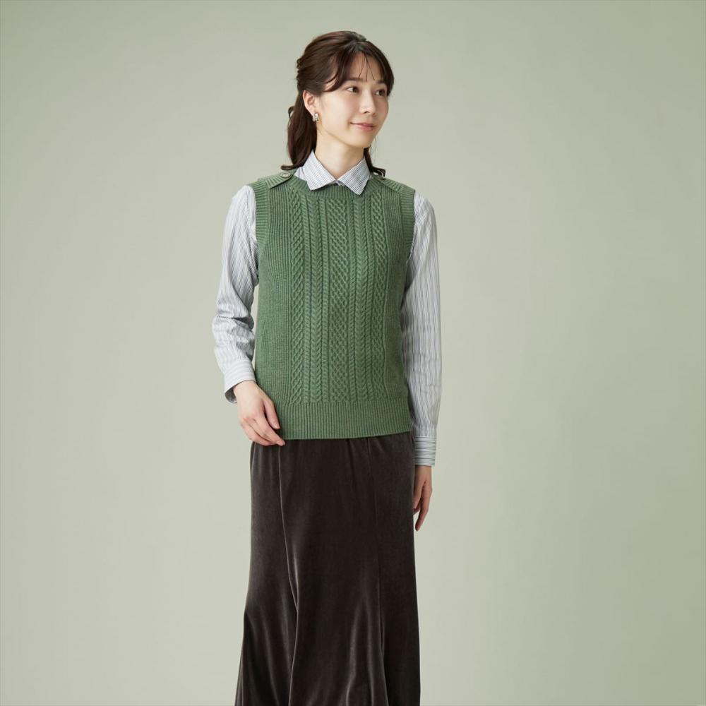 シンプルなデザインで毎日使える 釦がポイントのボートネックベスト。