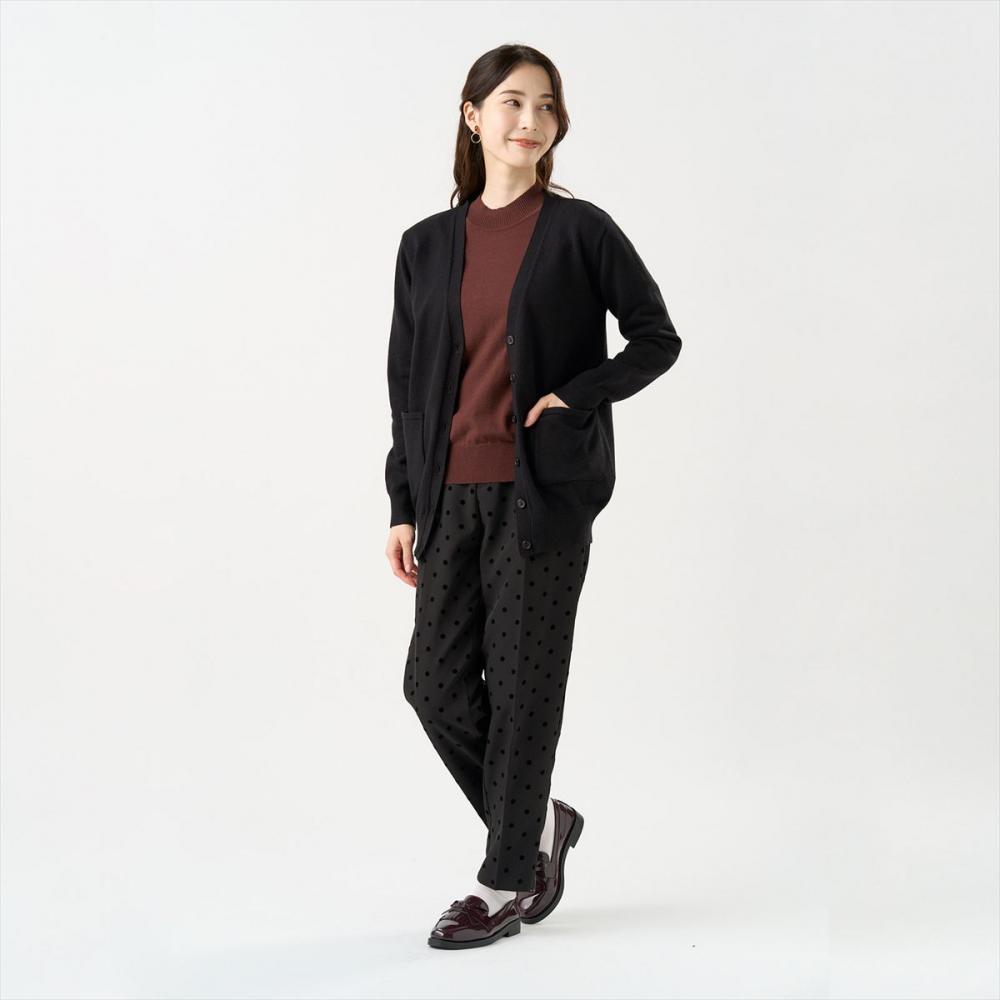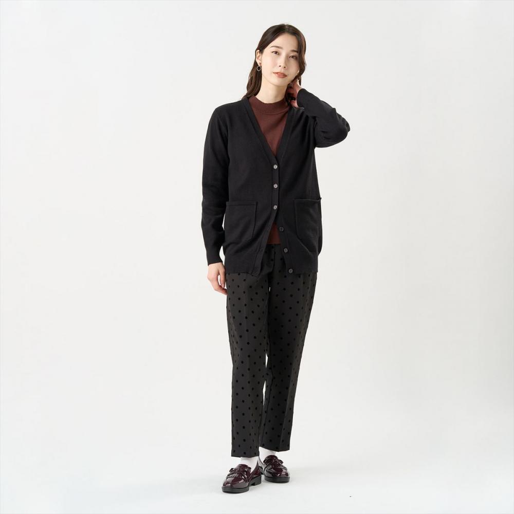 ポケット付きのミドルカーディガン。 やや長めの着丈感で暖かさをキープ。