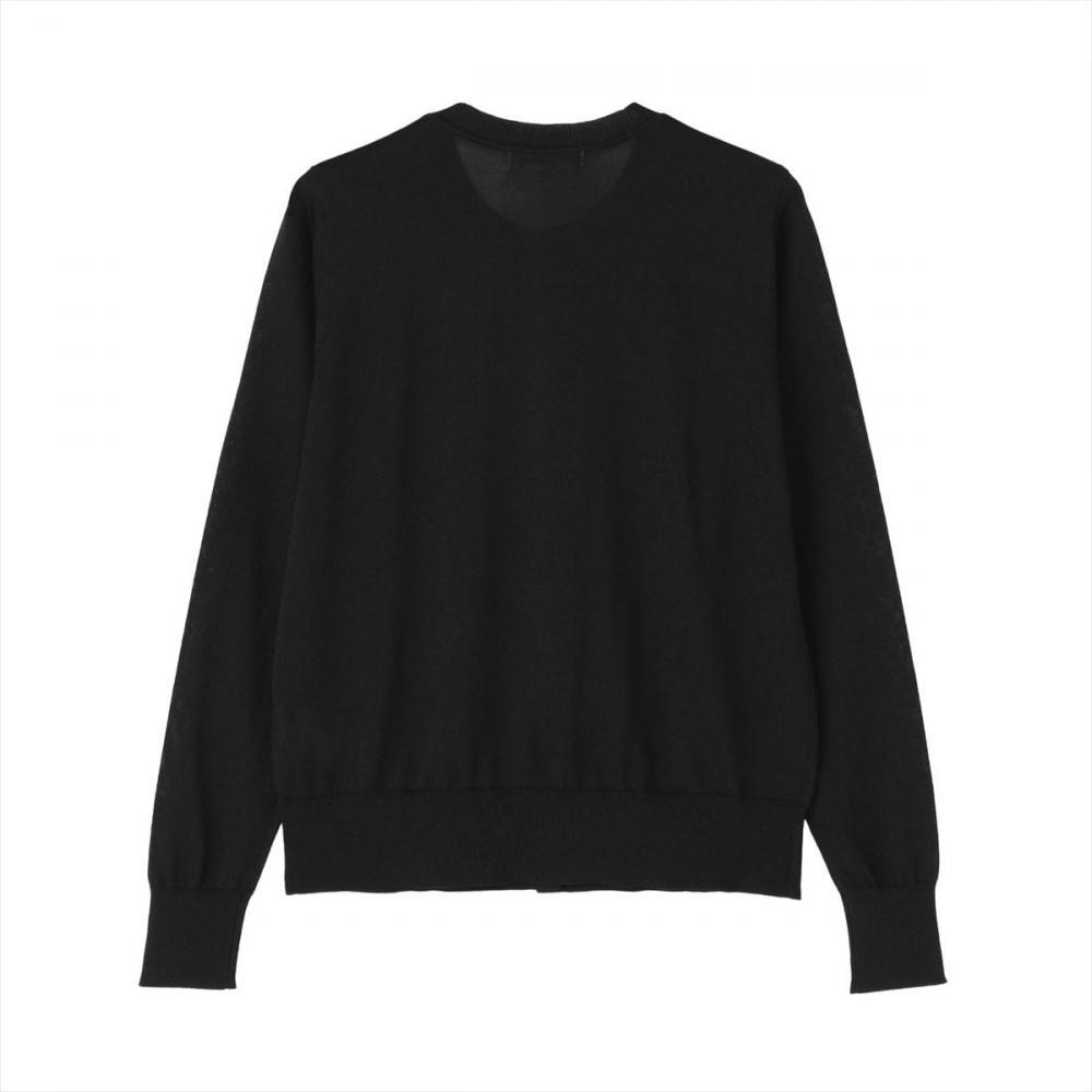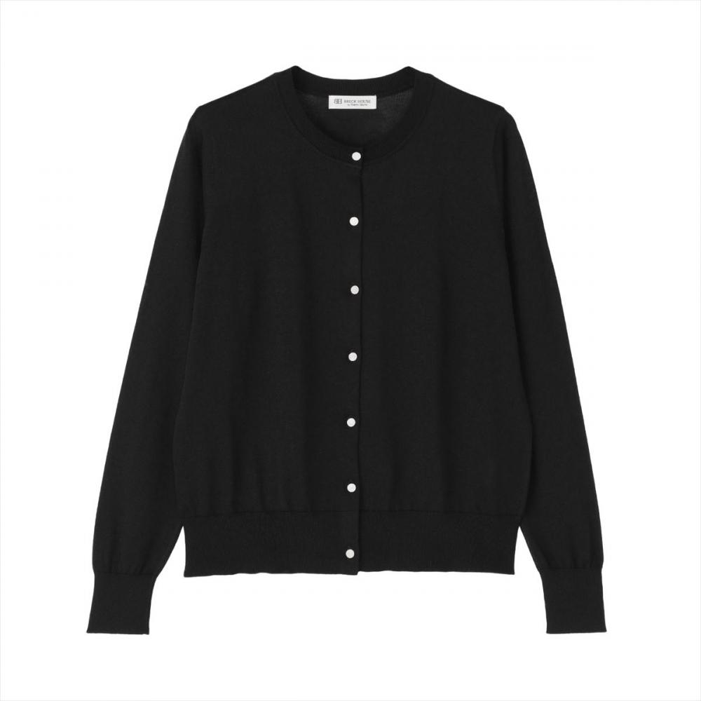 程よいシア感とメタル釦がアクセントに なったクルーネックカーディガンは ブラウスとのコーデも◎な一枚です。