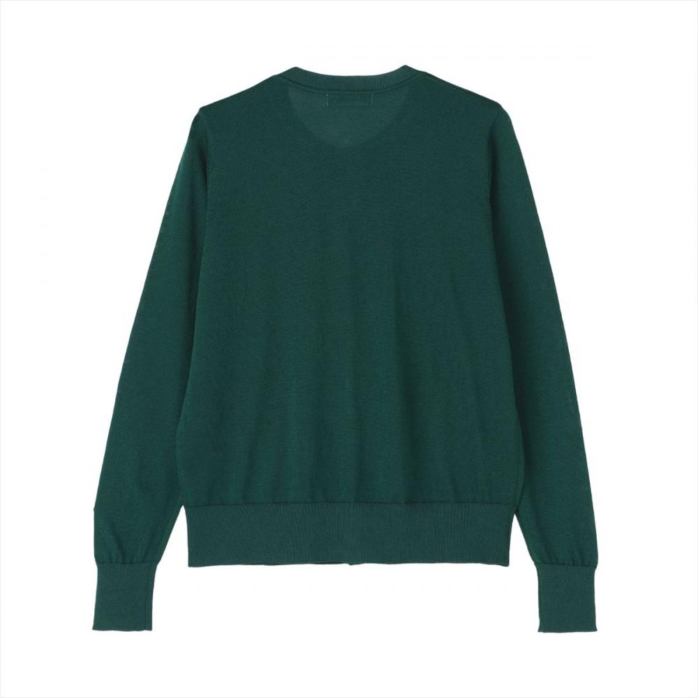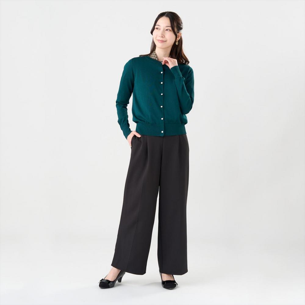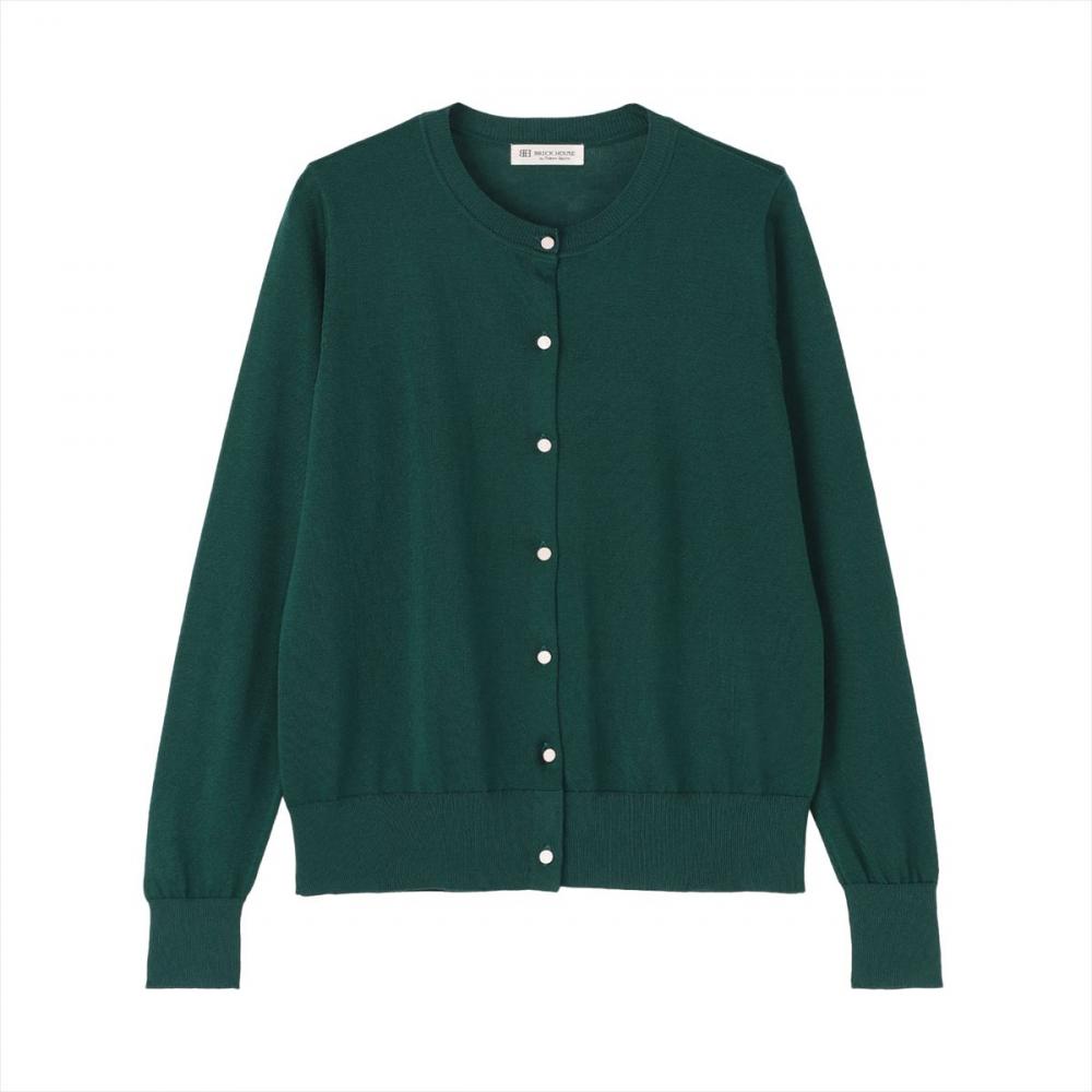 程よいシア感とメタル釦がアクセントに なったクルーネックカーディガンは ブラウスとのコーデも◎な一枚です。