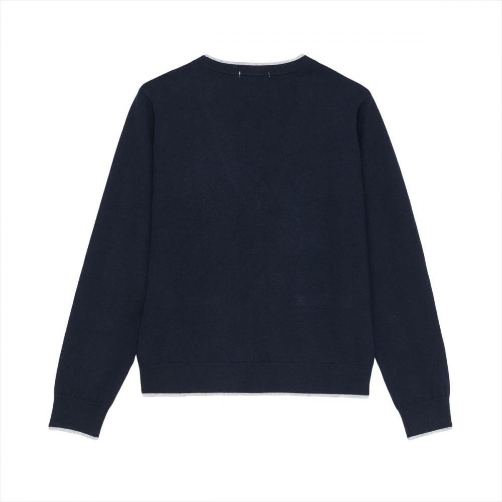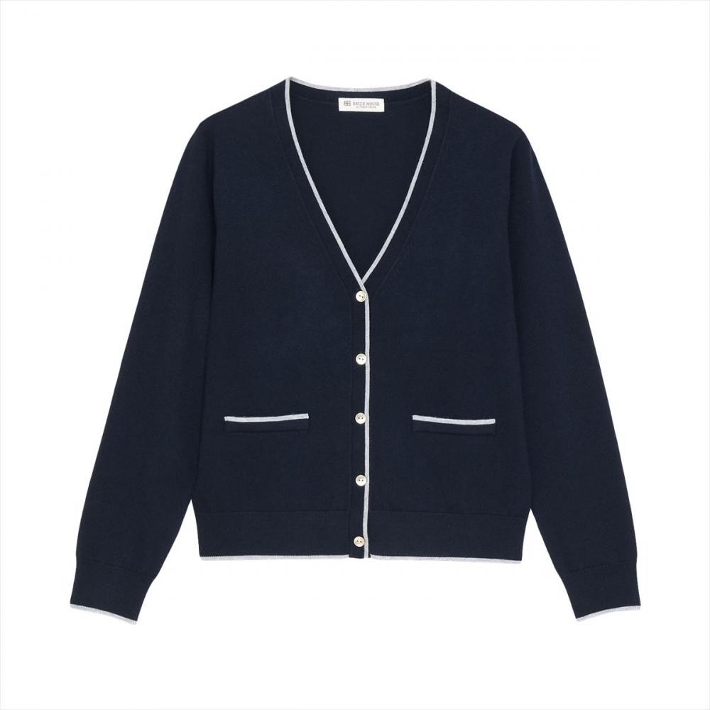 前立てから衿部分、フェイクポケットに アクセントの配色を施した 着回し力抜群のニットアイテムです。