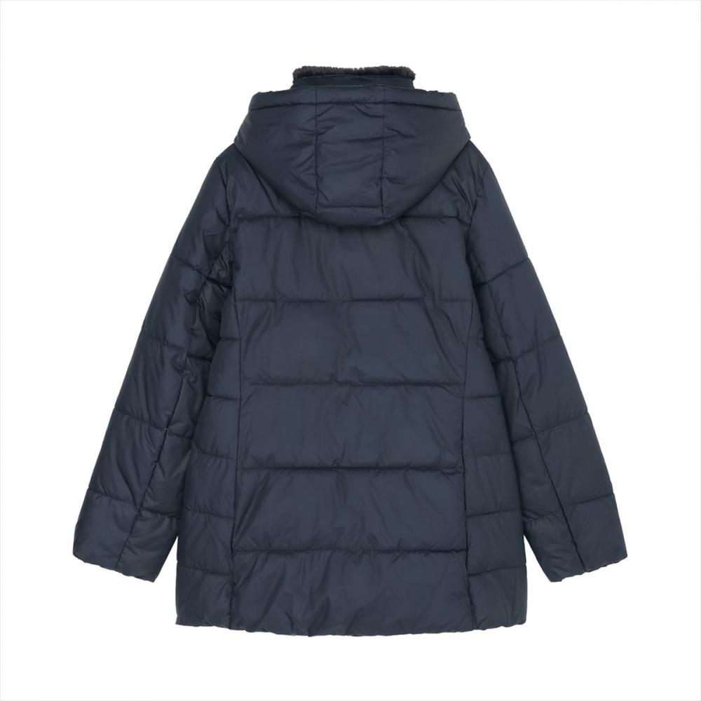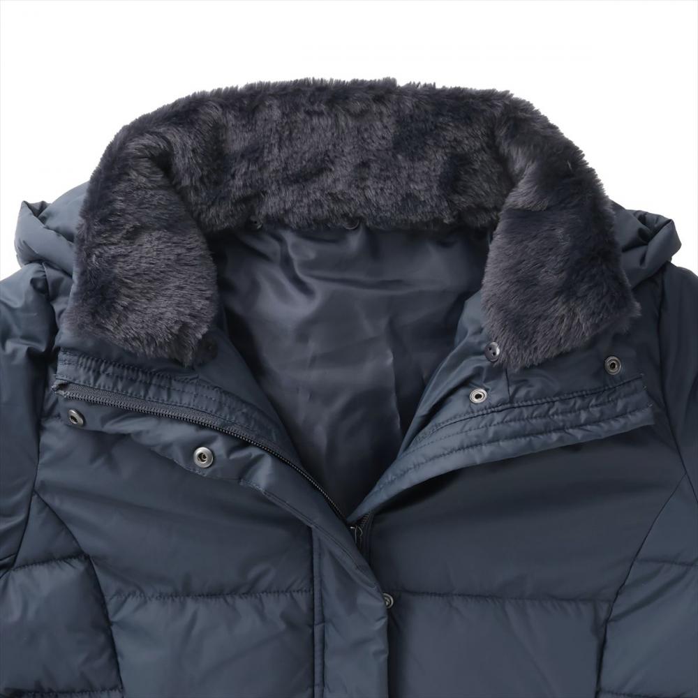 ネックファーとフードが付いた 軽くて暖かいファイバーダウンコート。