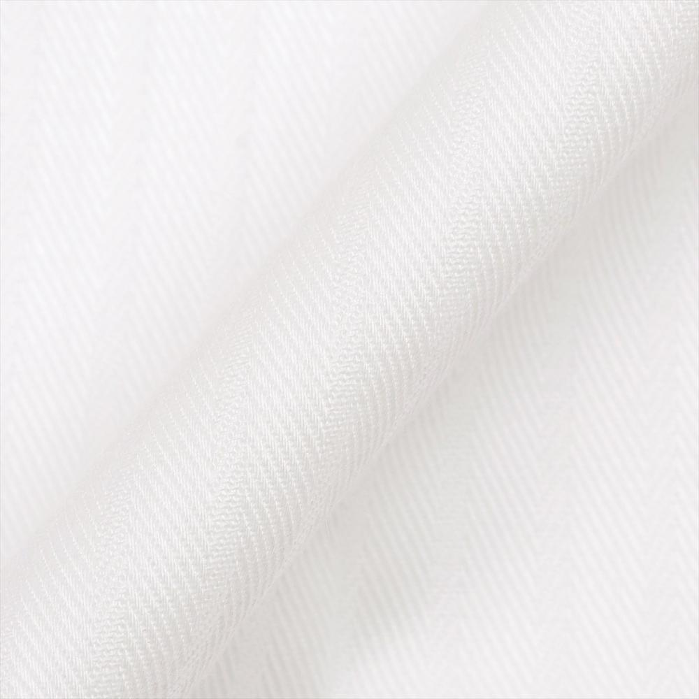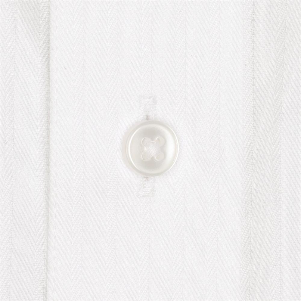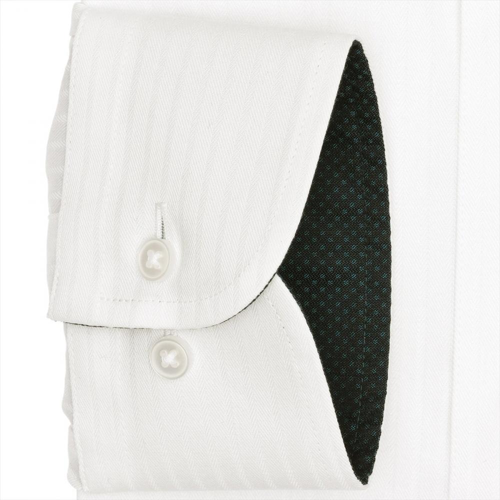 台衿ボタンを留めるとベーシックな 白ストライプ織柄シャツに見え、 ボタンを外すと台衿内側の別布が 衿元にアクセントを加えるシャツ。