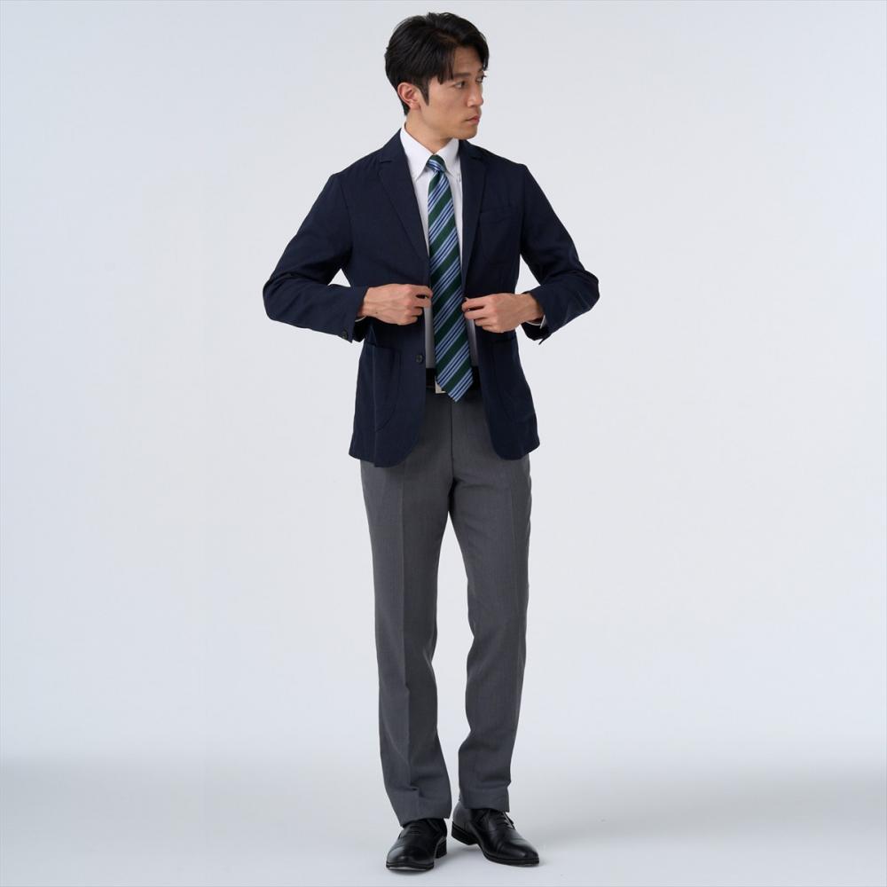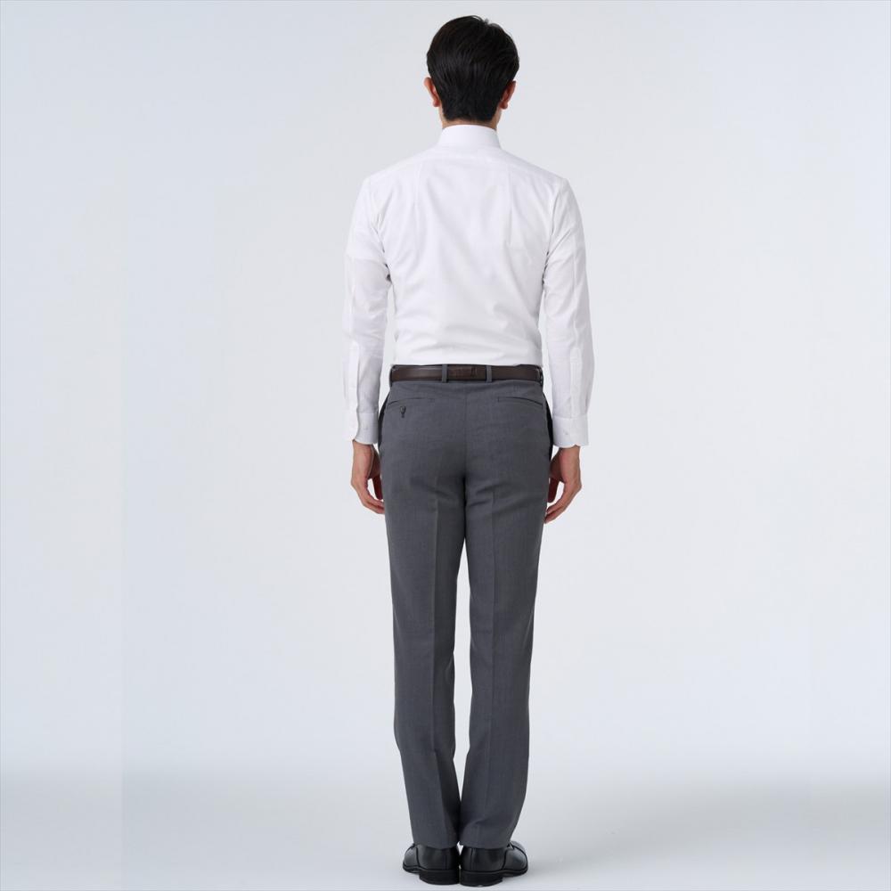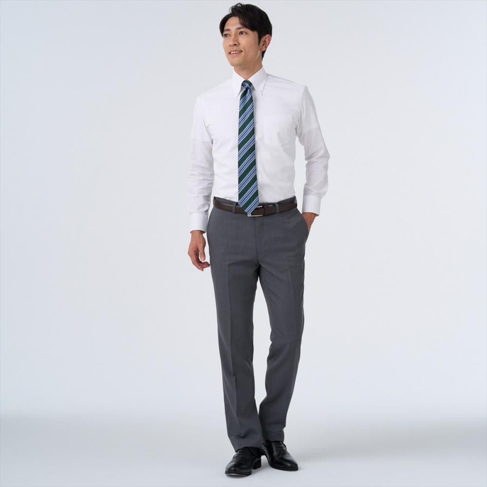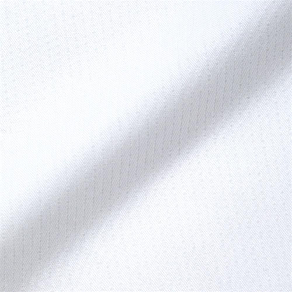 ベーシックな使いやすい白ストライプ織柄シャツはスマートな印象のコーディネイトに仕上がります。
