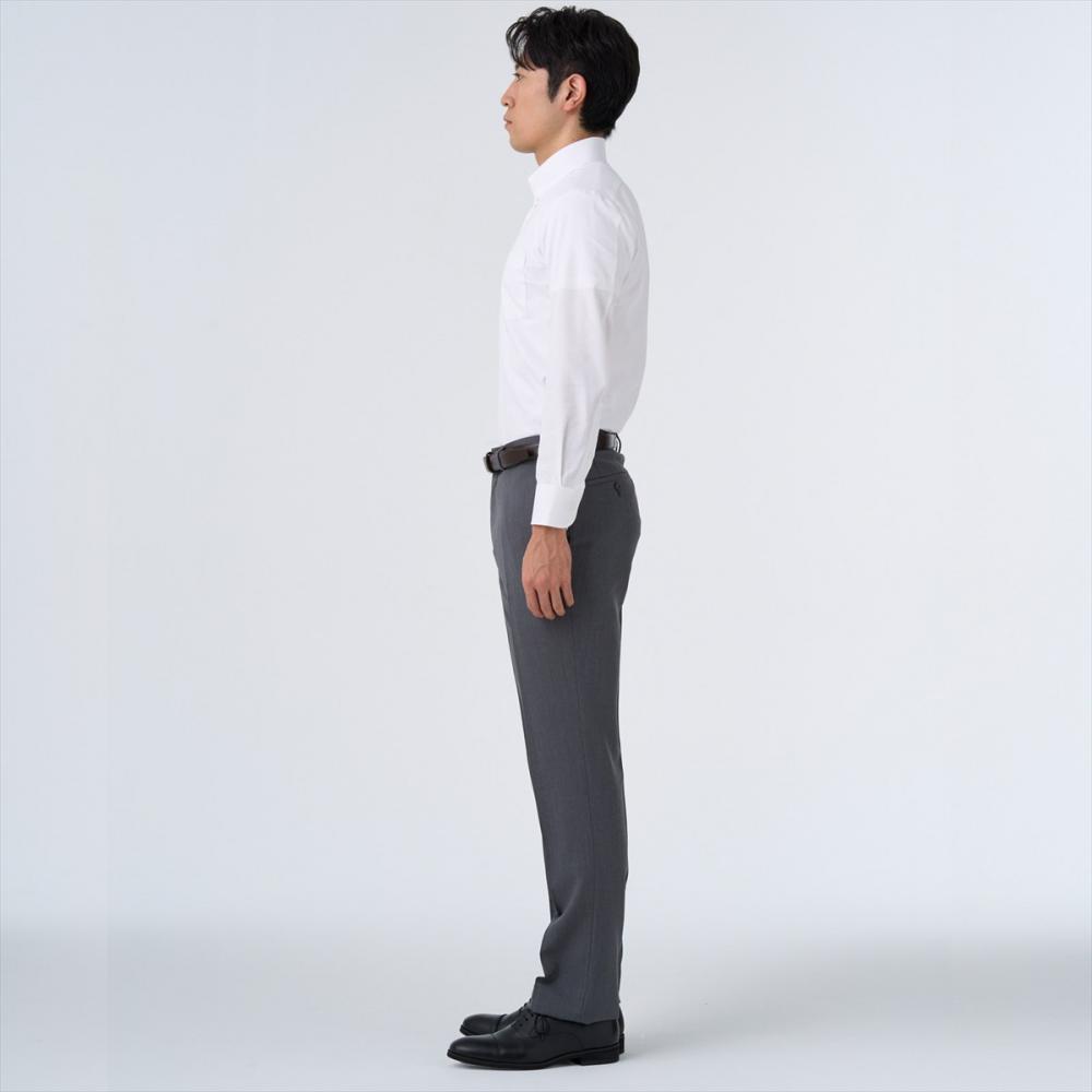 ノータイでの着用をイメージしたボタンダウンシャツなので、すっきりとしたラインを強調するために通常サイズと比べてすっきりとしたサイズ感に調整しました。