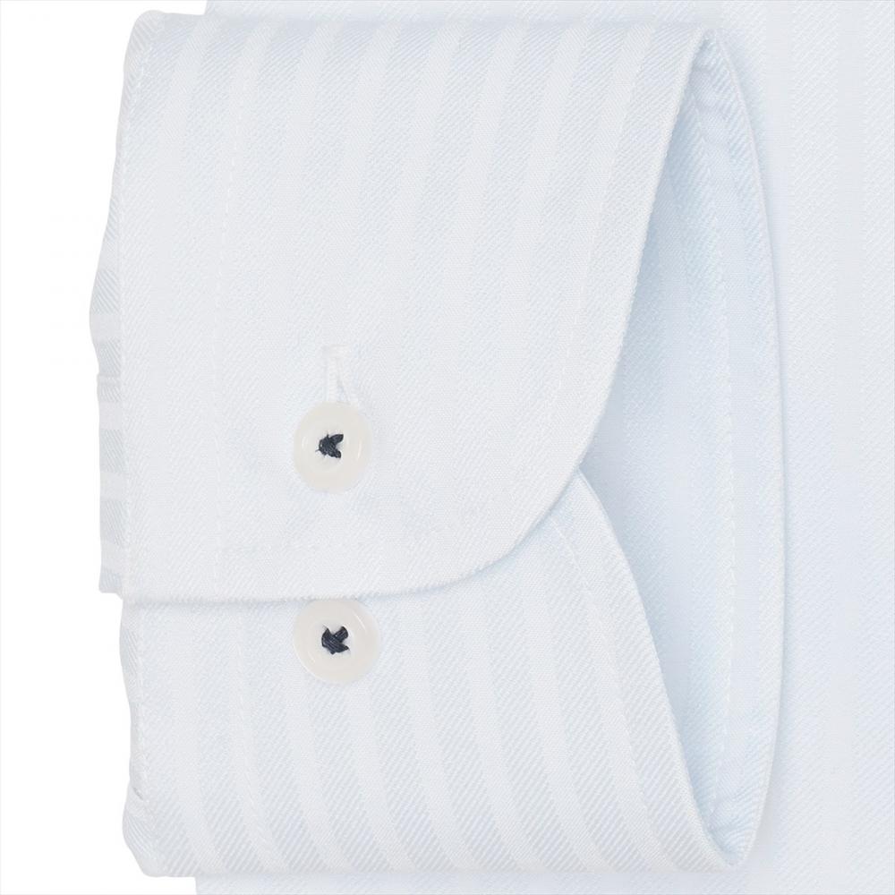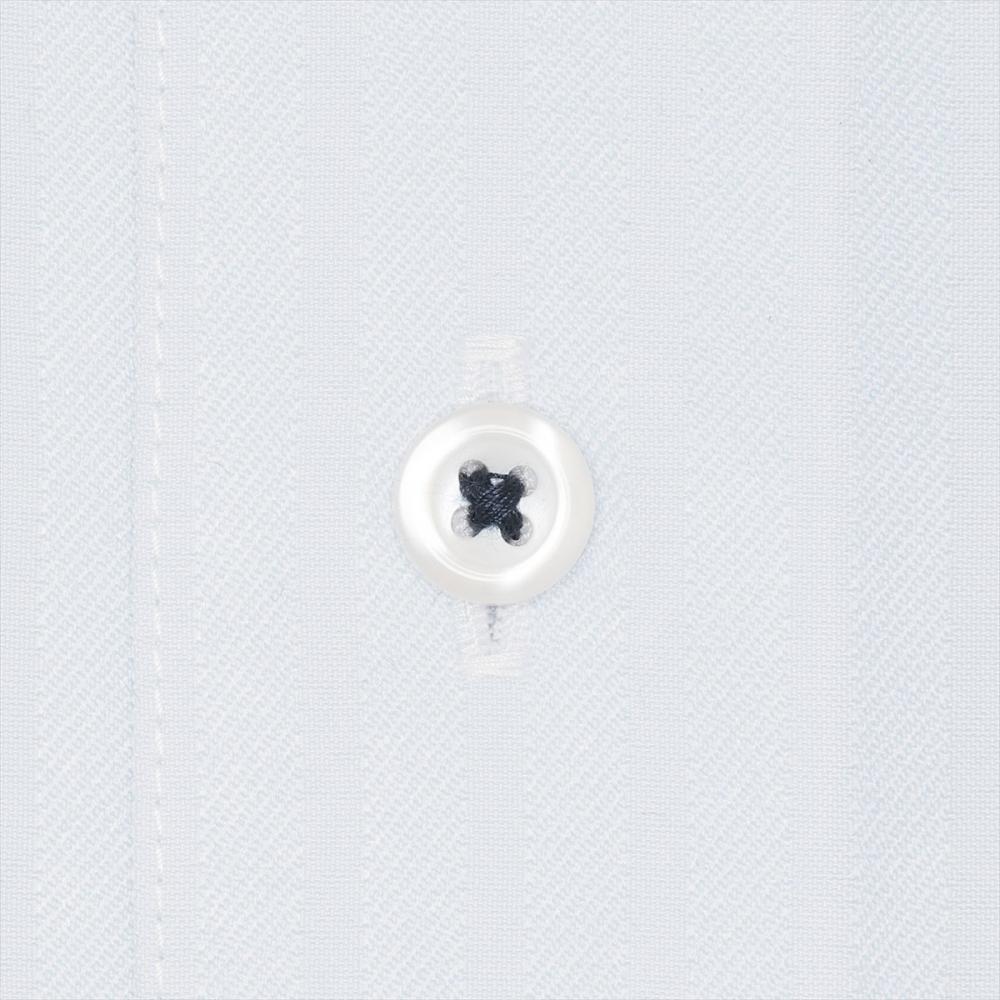 爽やかで清潔感漂うサックスカラーの ストライプ織シャツにボタン付け糸で さり気なくアクセントをプラス。
