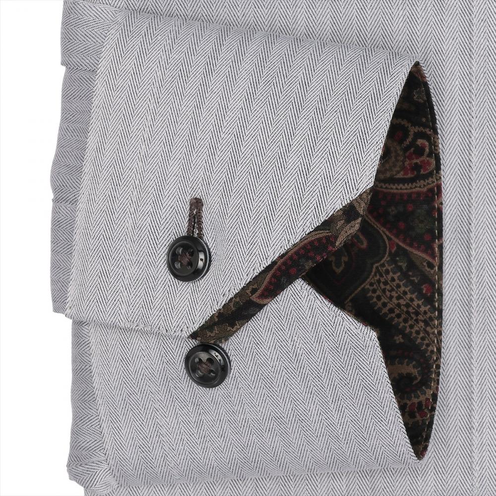 落ち着いた色合いのヘリンボーン織柄に、 台衿とカフス裏にはヴィンテージ調の ペイズリー柄別布を採用し上品さの中に こなれた雰囲気をプラスしました。