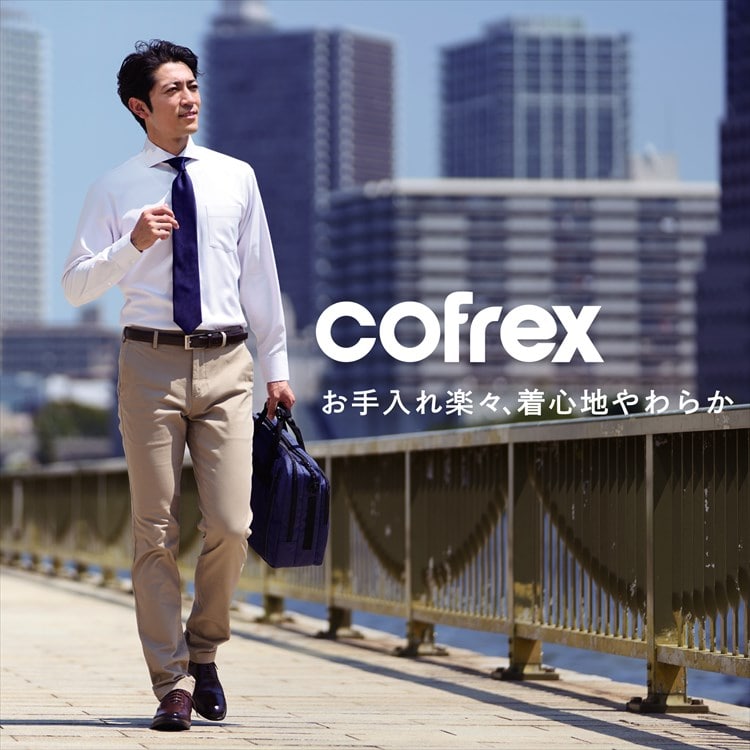 綿のようにやわらかな風合いでさらっと した快適な着心地を実現した コフレックス生地をきっちり感ある ドレスシャツに仕上げ、 快適なビジネススタイルに。