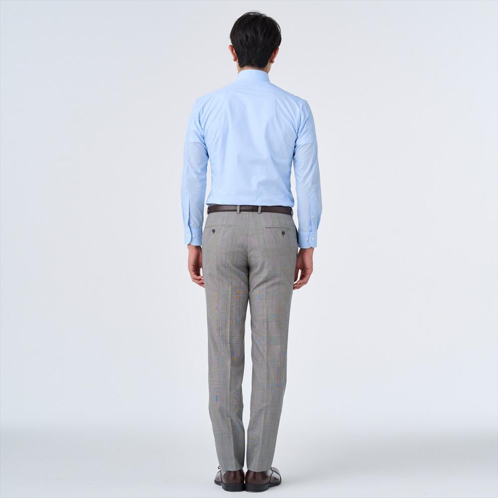 ノータイでの着用をイメージしたボタンダウンシャツなので、すっきりとしたラインを強調するために通常サイズと比べてすっきりとしたサイズ感に調整しました。