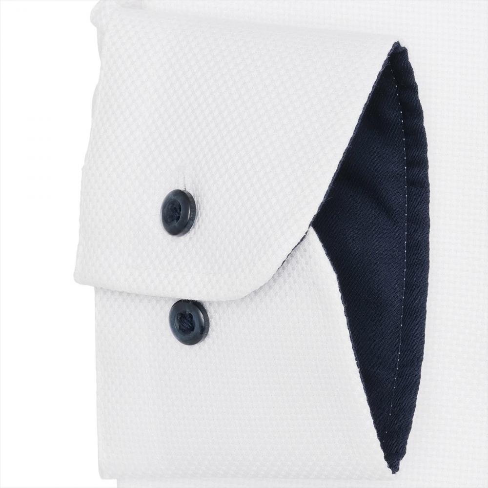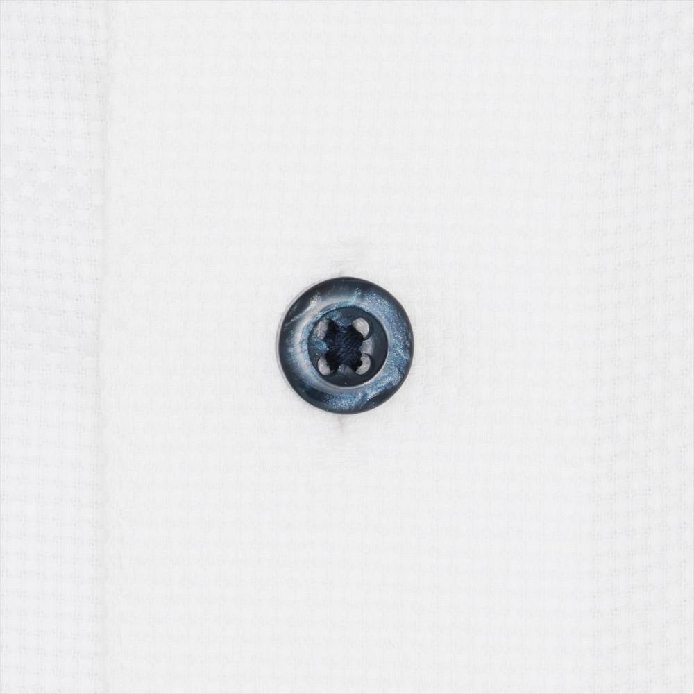 白オックス調織生地に、台衿とカフス裏 の別布使いやマーブル色ボタンを 取り入れアクセントを添えた一枚。