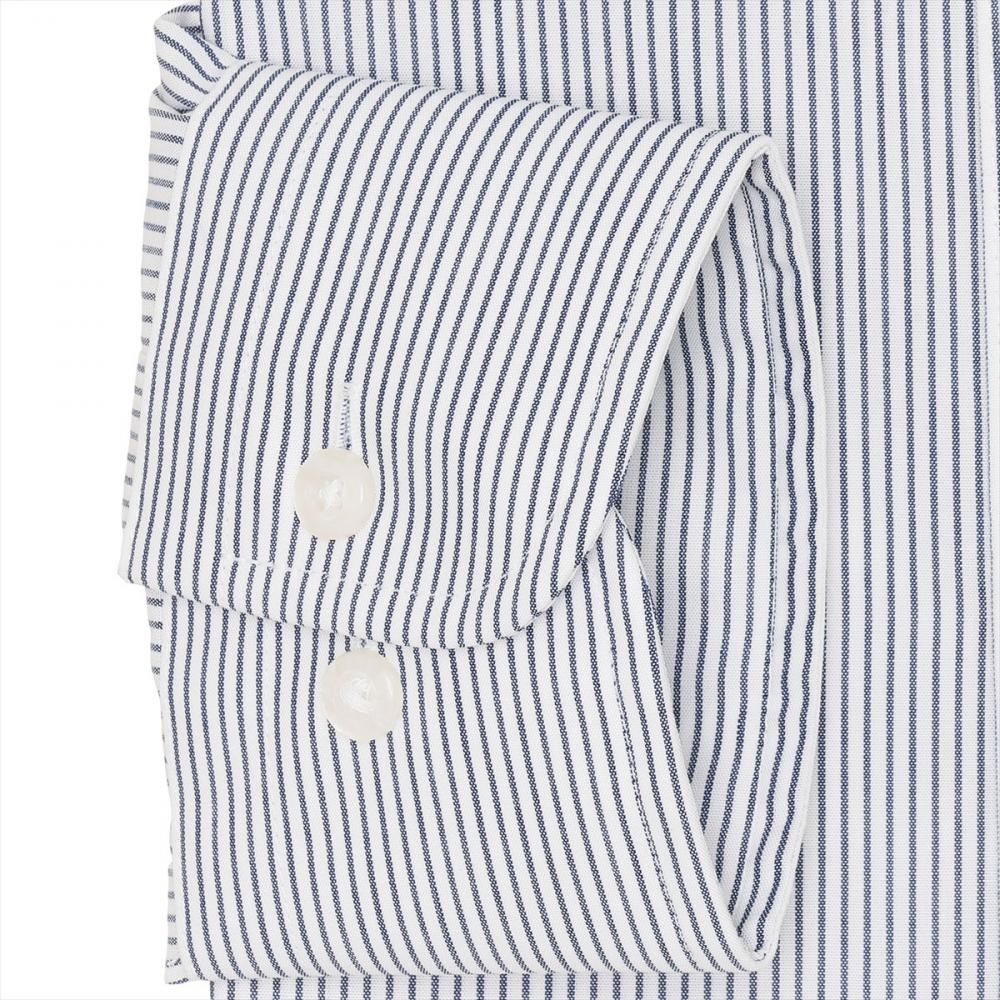 はっきりとしたブルーストライプ柄は スラックスやチノパン等、ボトムスを 変えることでコーデの幅が広がります。