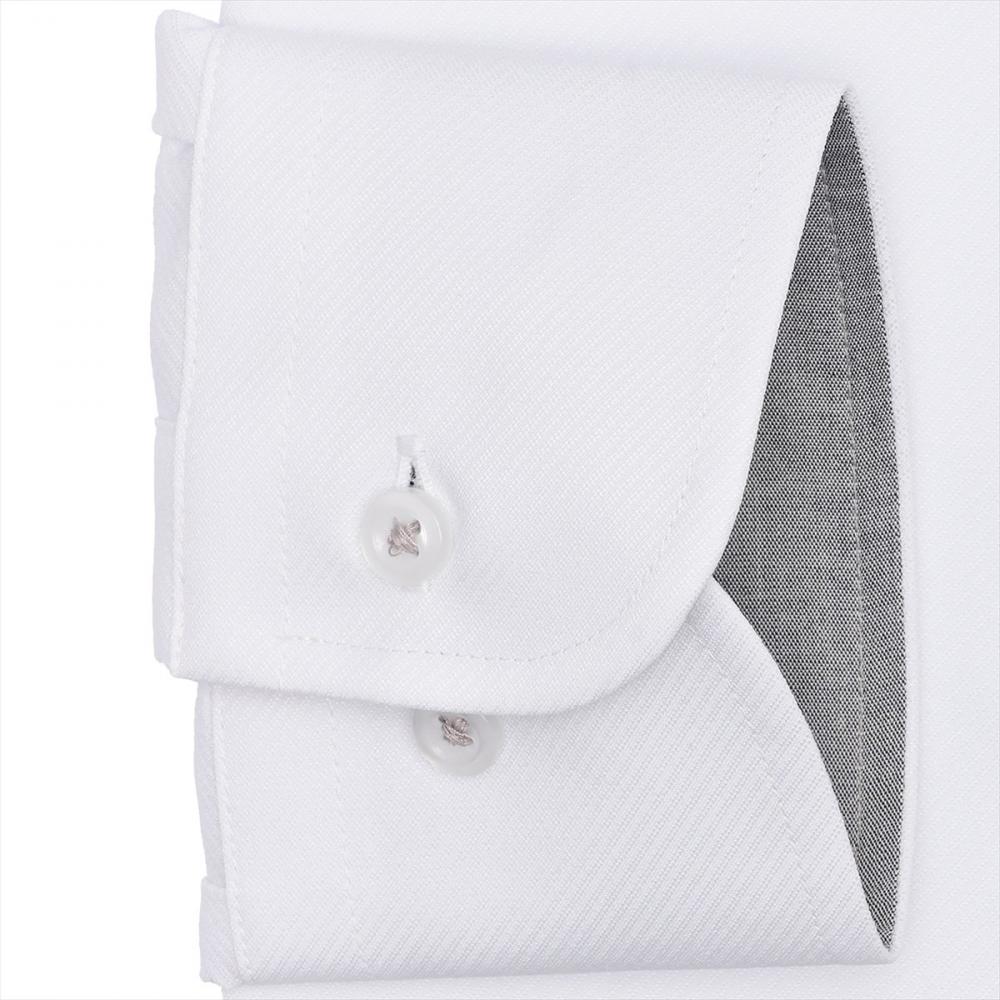白斜めストライプ織生地に台衿と カフス裏の別布使いとボタン付け糸の ライトグレー色糸がアクセントを加え、 個性ある衿元を演出してくれます。