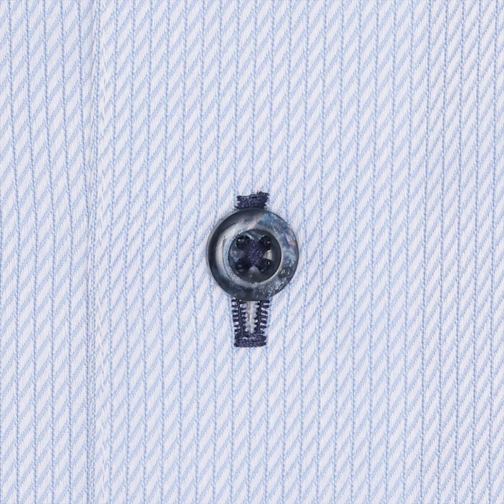 細めのストライプ織柄の入った身生地に 台衿とカフス裏の別布使いに色ボタンを 同系色に統一しながらも、アクセントを 添えた一枚は個性ある衿元を演出します。