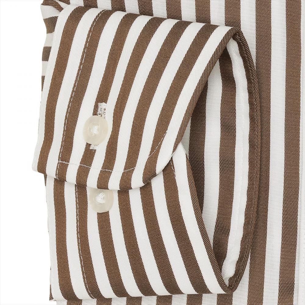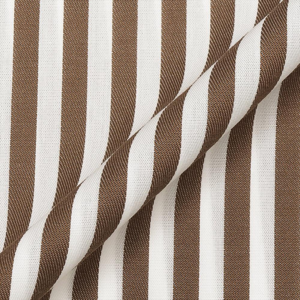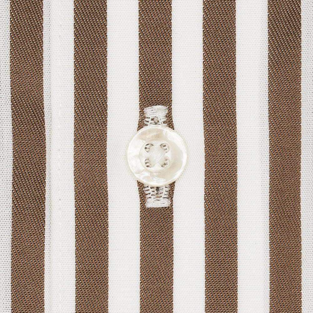 はっきりとしたブラウンストライプ柄は スラックスやチノパン等、ボトムスを 変えることでコーデの幅が広がります。