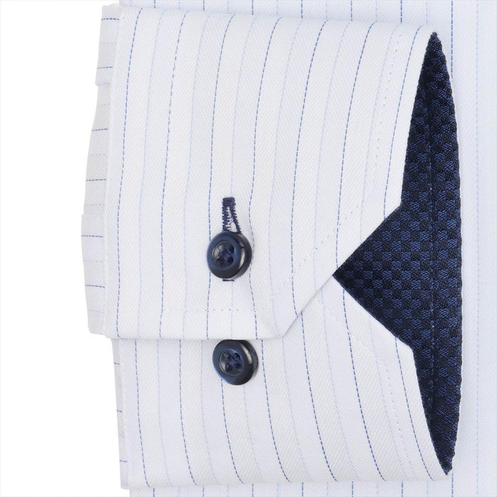 台衿とカフス裏の別布使いに色ボタンを 同系色に統一しながらも、アクセントを 添えた一枚は個性ある衿元を演出します。