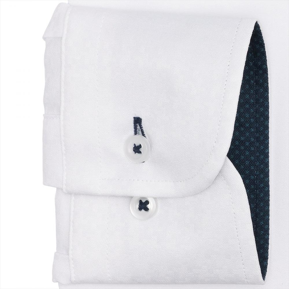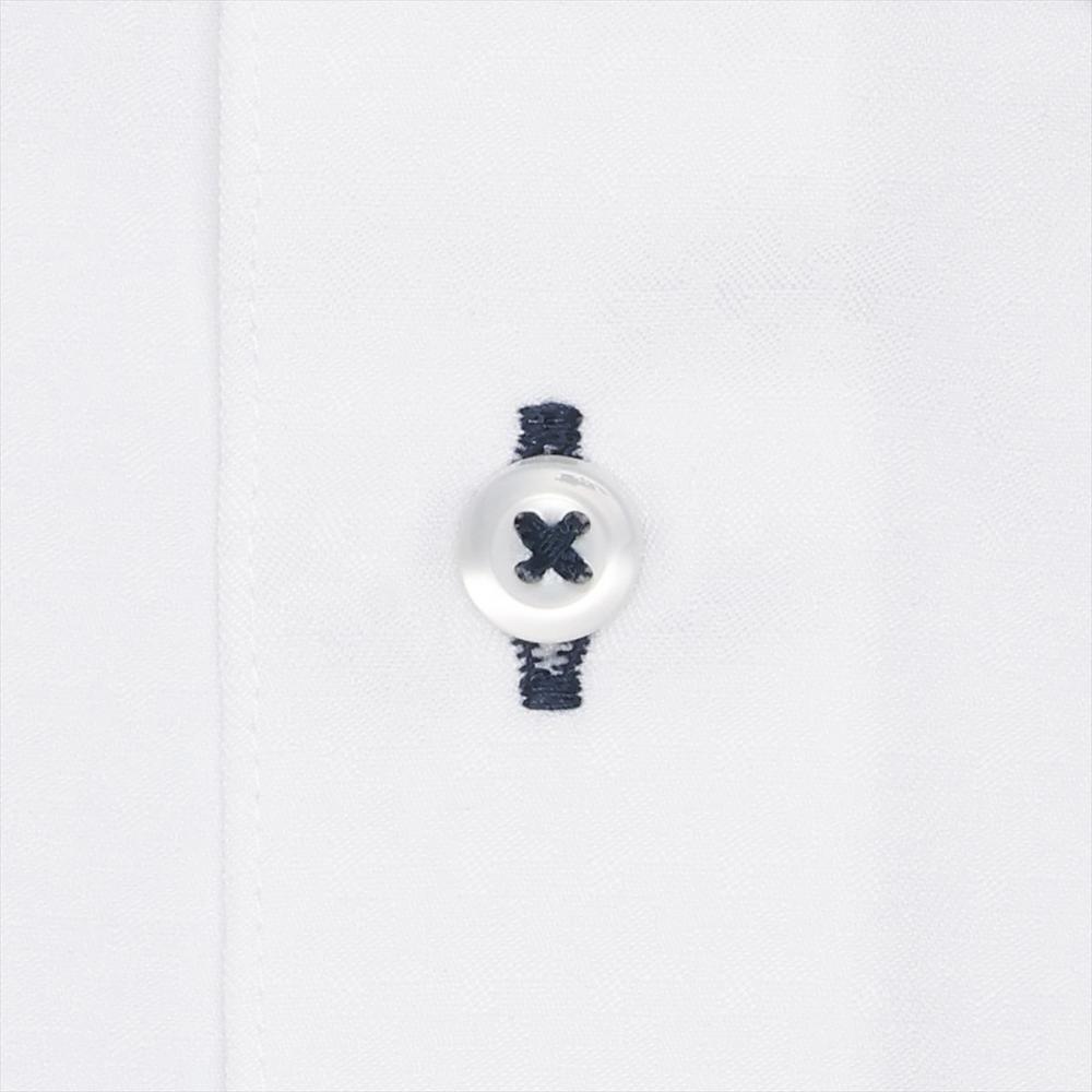 白い千鳥格子風織柄生地に、台衿と カフス裏の別布使いとボタン付け糸の ネイビー色糸がアクセントを加えてくれ 個性ある衿元を演出してくれます。
