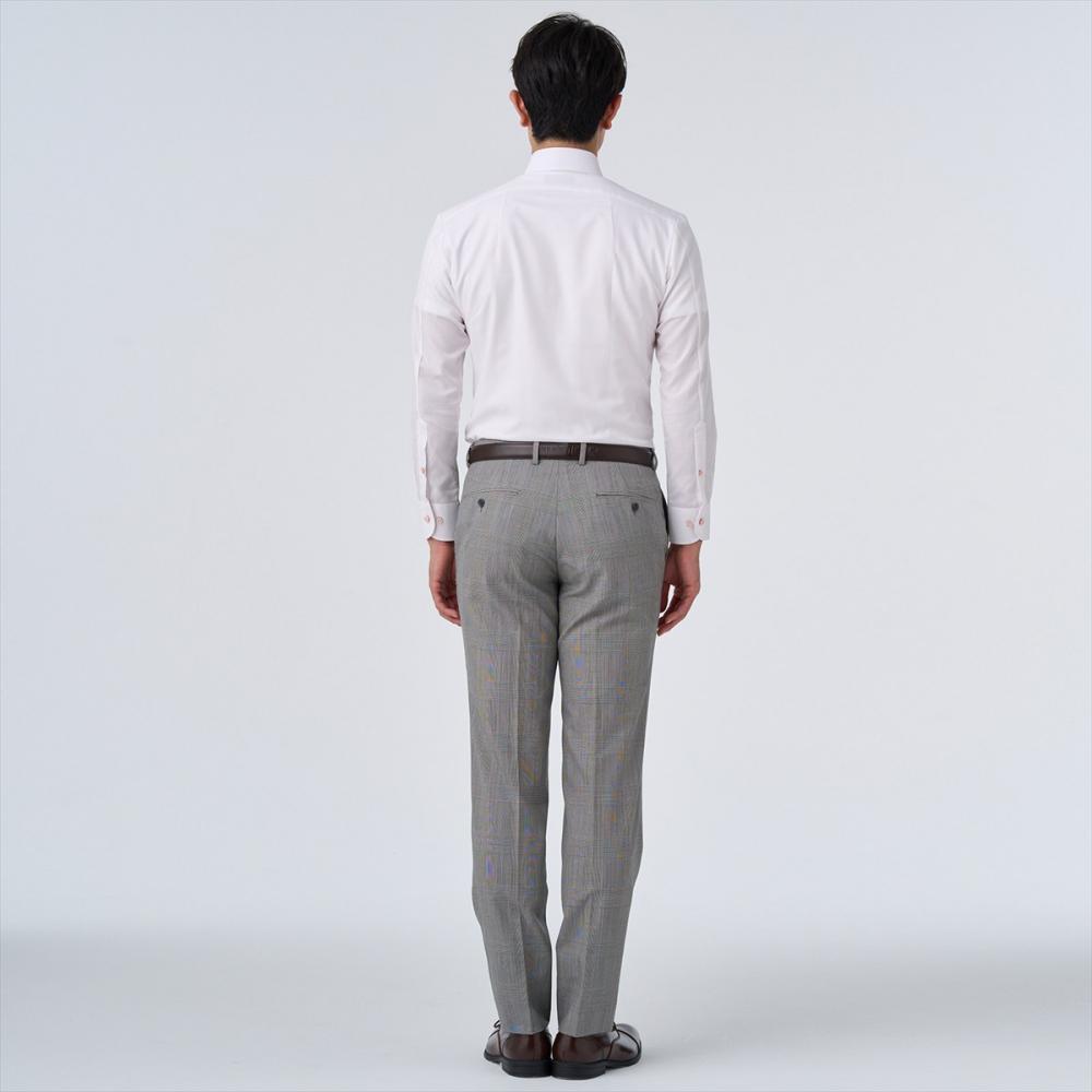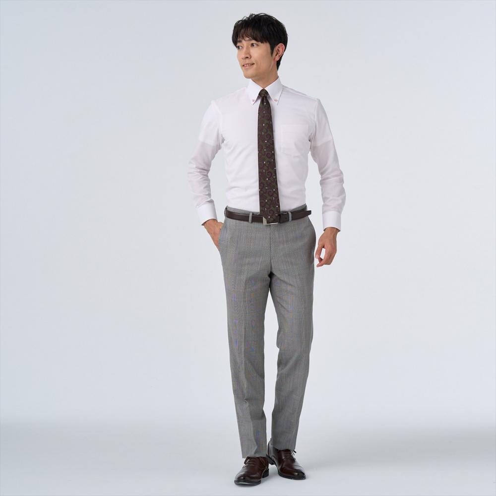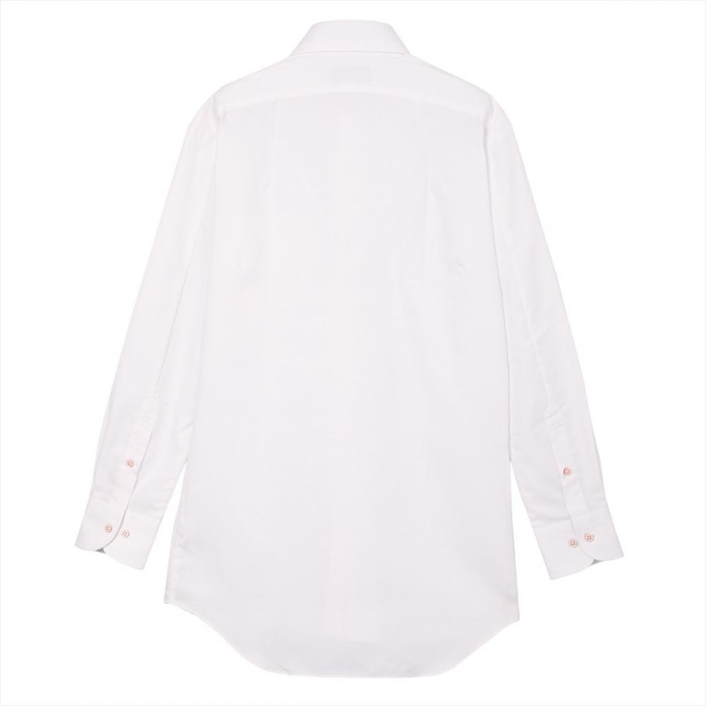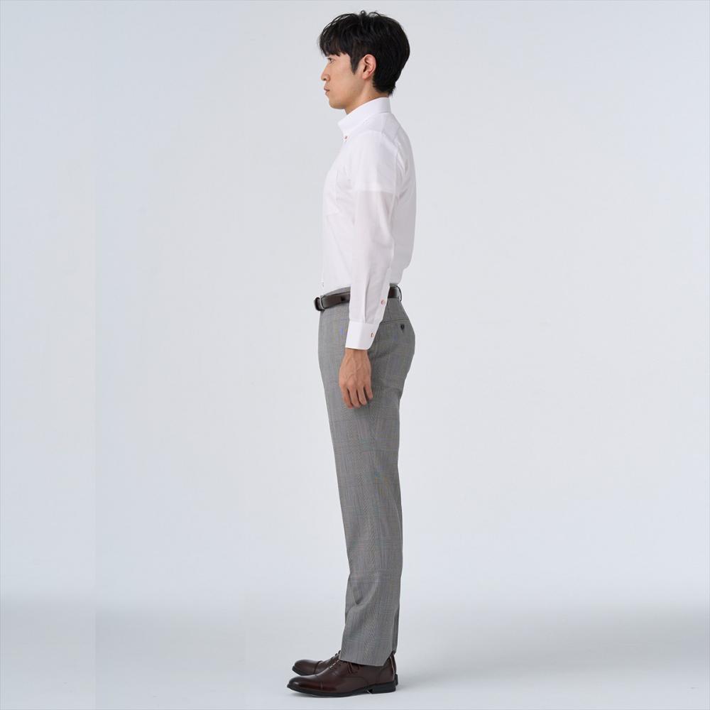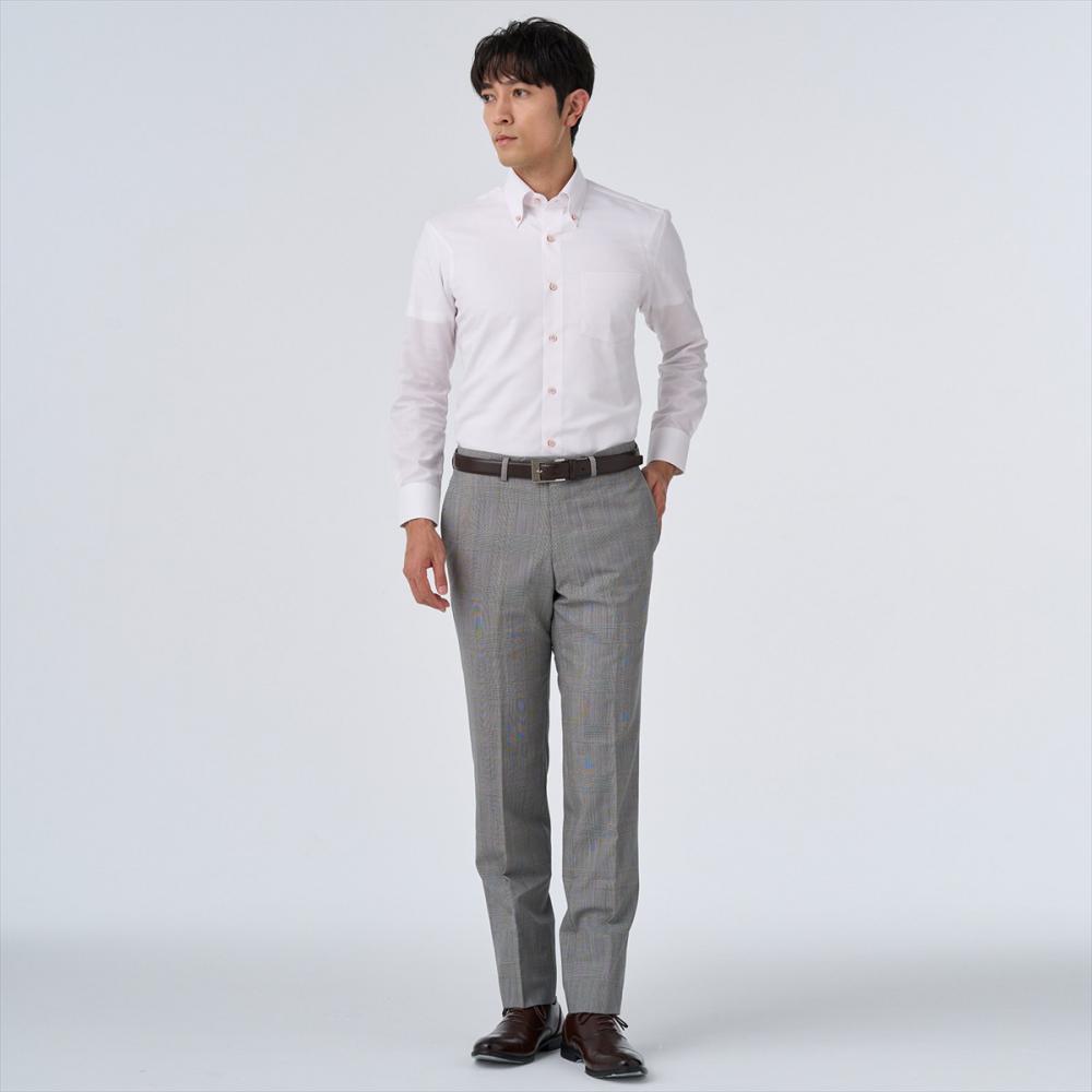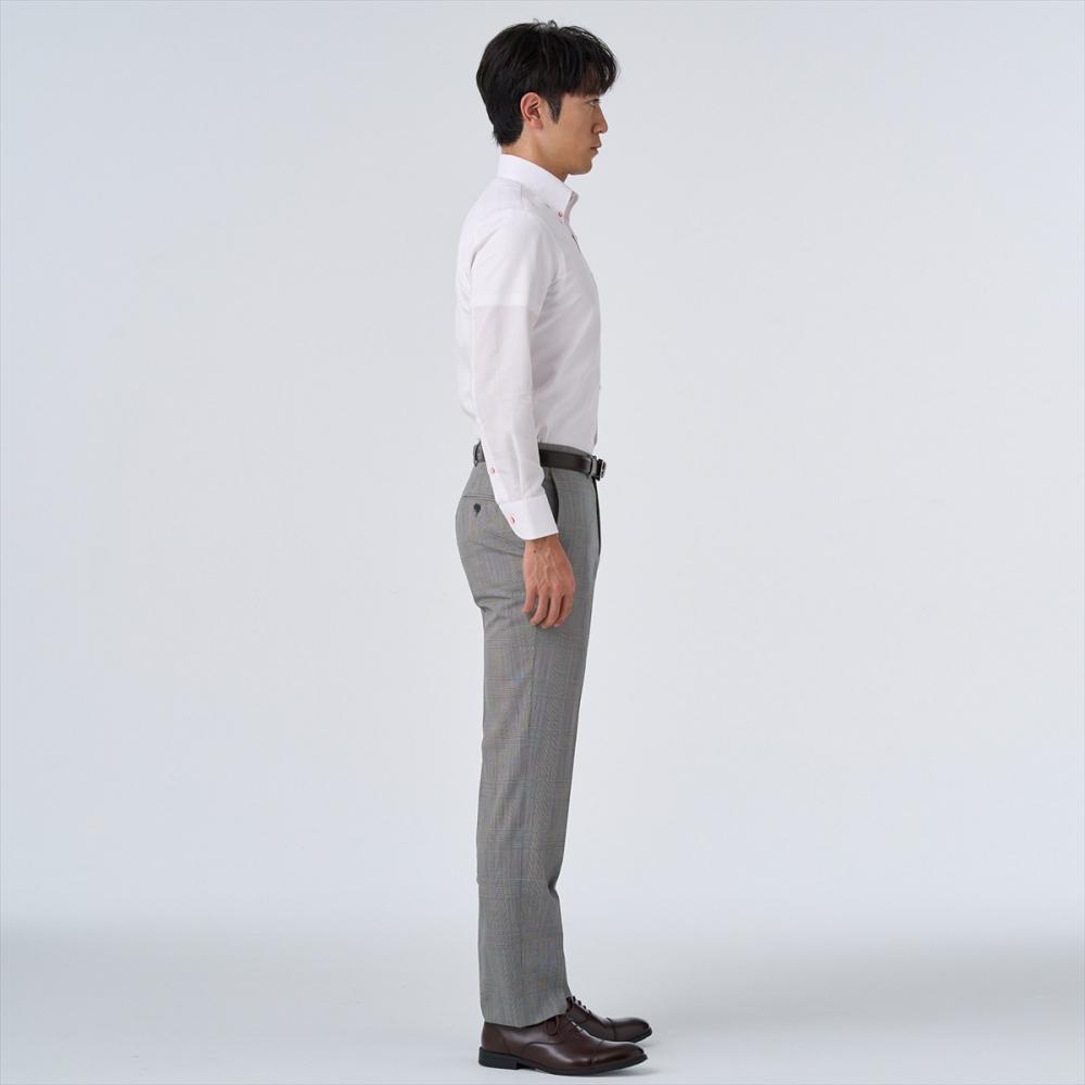 ノータイでの着用をイメージしたボタンダウンシャツなので、すっきりとしたラインを強調するために通常サイズと比べてすっきりとしたサイズ感に調整しました。