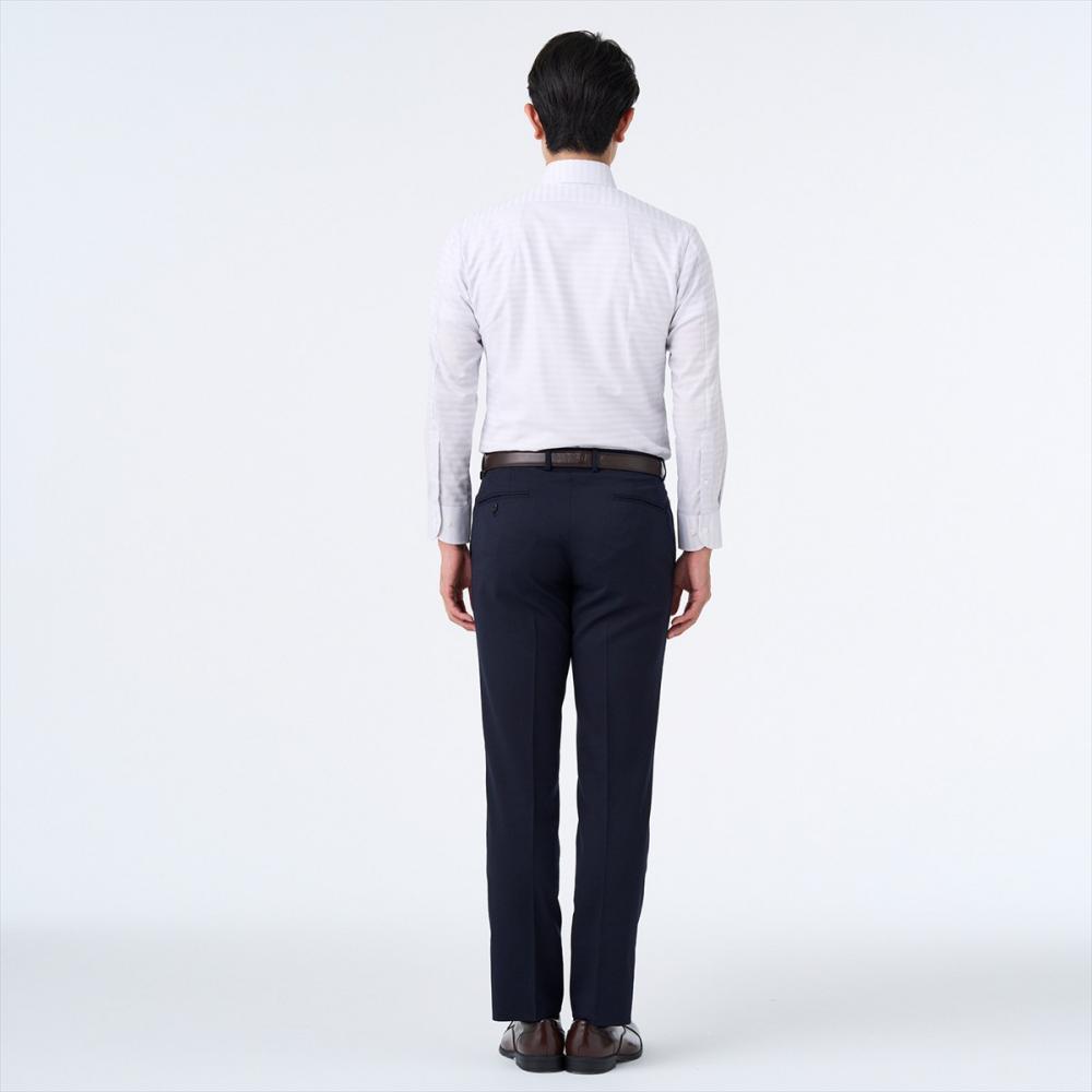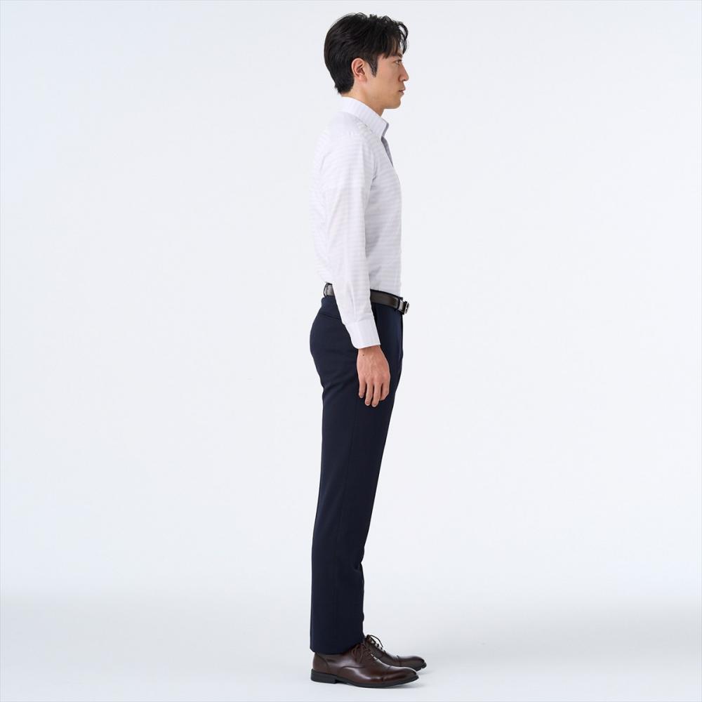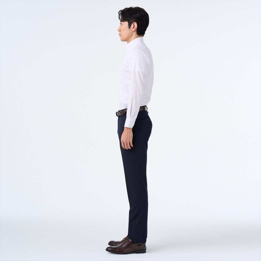 ノータイでの着用をイメージしたボタンダウンシャツなので、すっきりとしたラインを強調するために通常サイズと比べてすっきりとしたサイズ感に調整しました。