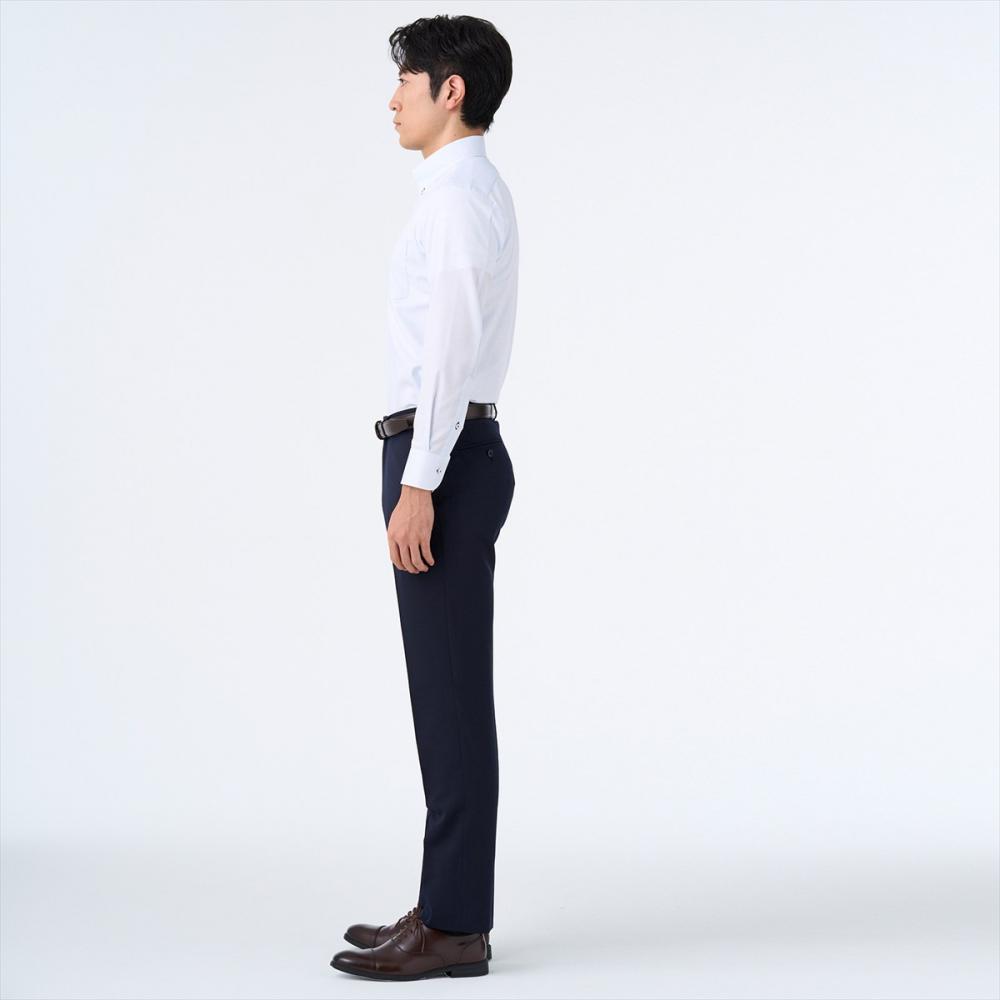 ノータイでの着用をイメージしたボタンダウンシャツなので、すっきりとしたラインを強調するために通常サイズと比べてすっきりとしたサイズ感に調整しました。