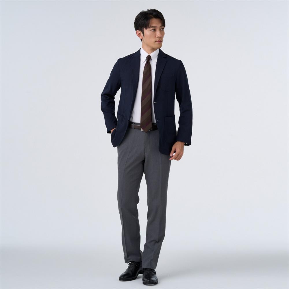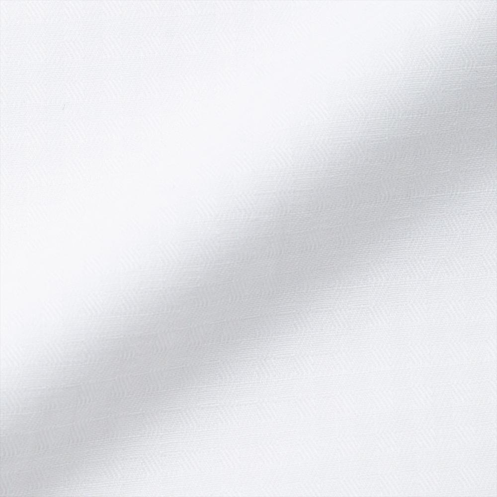 光の加減で織柄が浮かび上がる白チェック織柄シャツはジャケットのありなしで雰囲気が変わります。