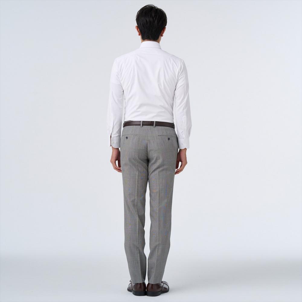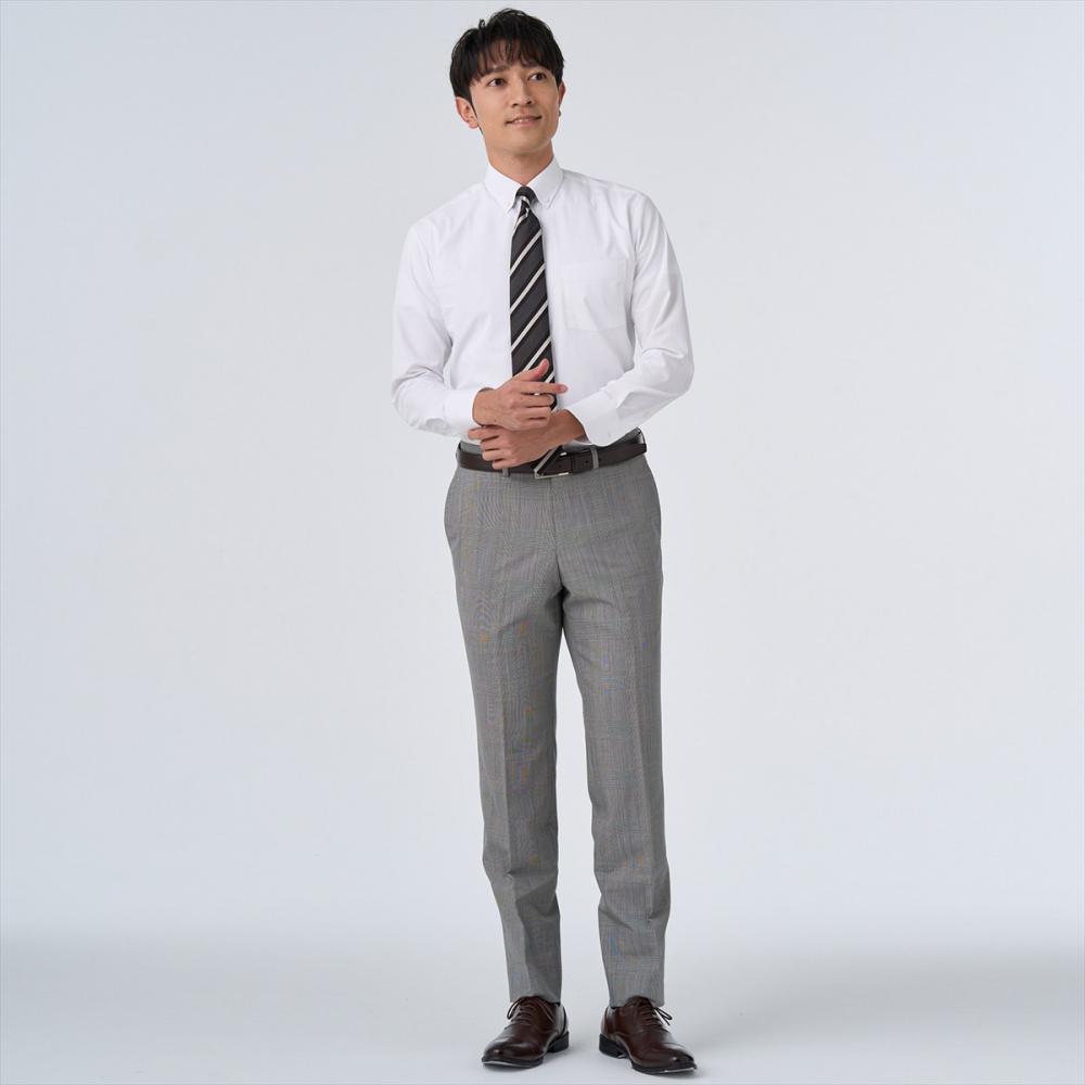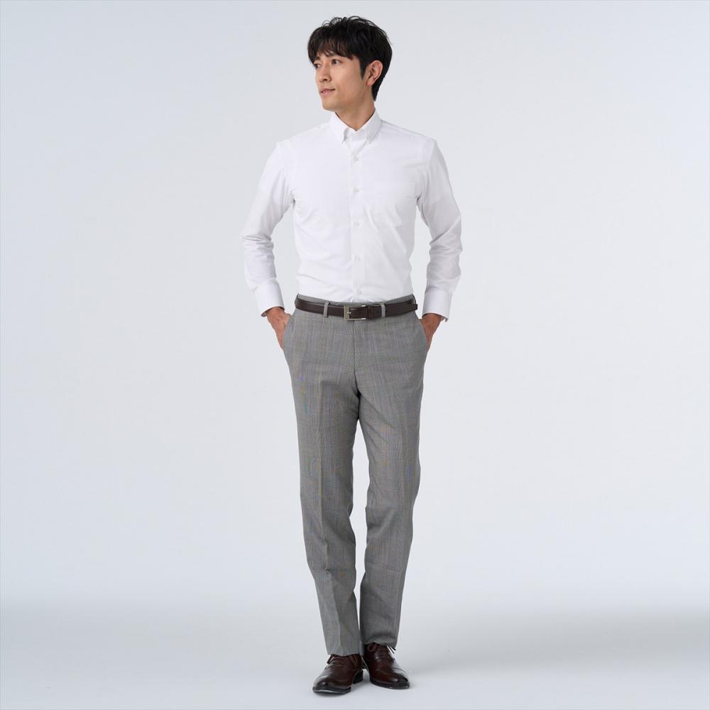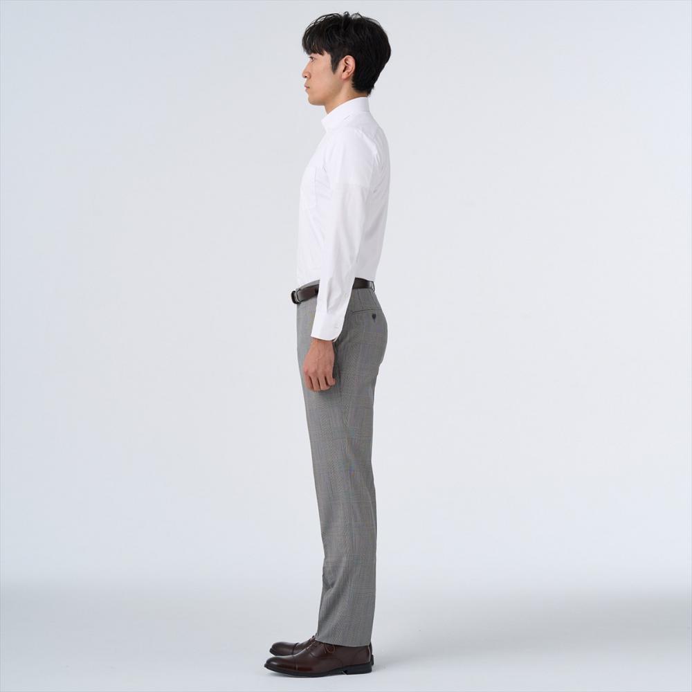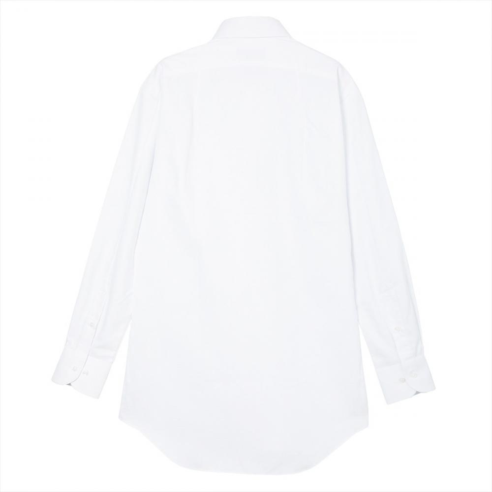 ノータイでの着用をイメージしたボタンダウンシャツなので、すっきりとしたラインを強調するために通常サイズと比べてすっきりとしたサイズ感に調整しました。
