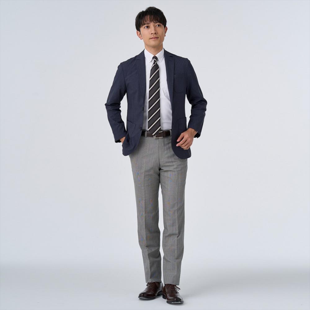 光の加減で織柄が浮かび上がる白織柄シャツはジャケットのありなしで雰囲気が変わります。