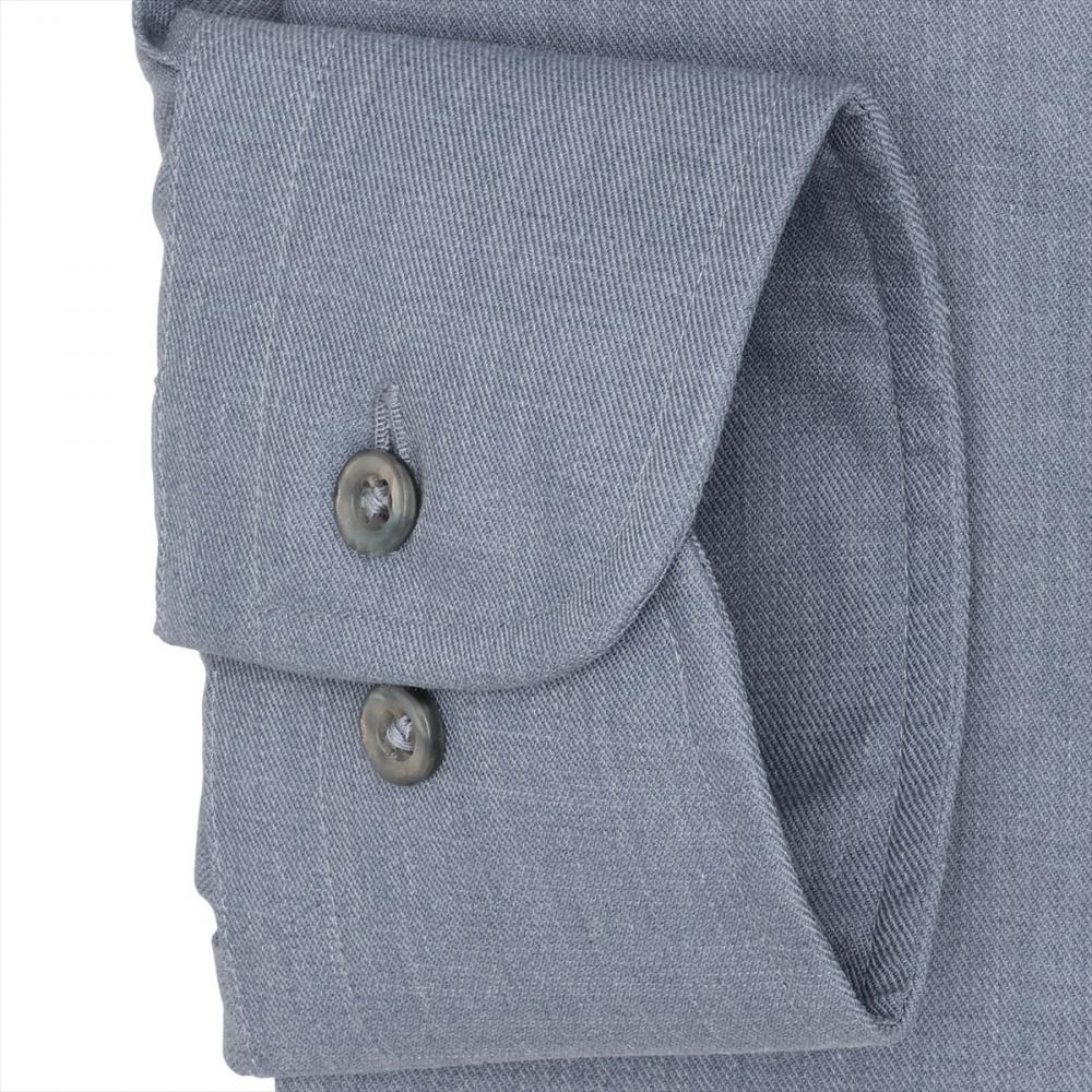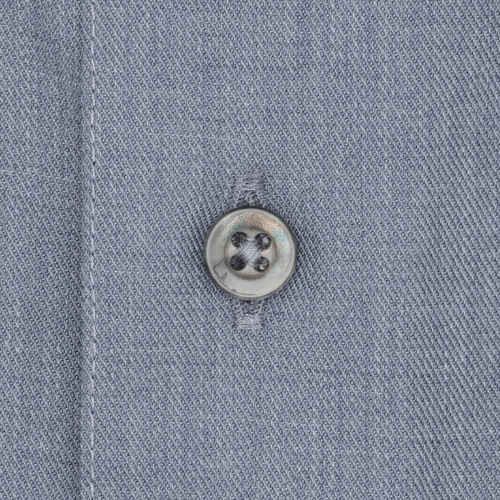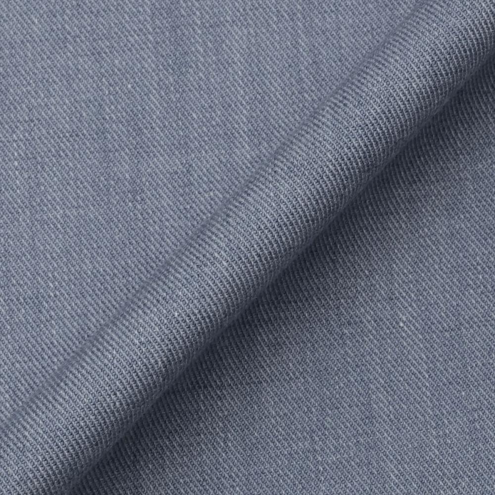 落ち着いたブルーデニム風織の生地に 台衿とカフス裏の別布使いやマーブル 色ボタンがお洒落なポイント。