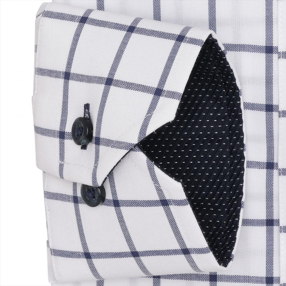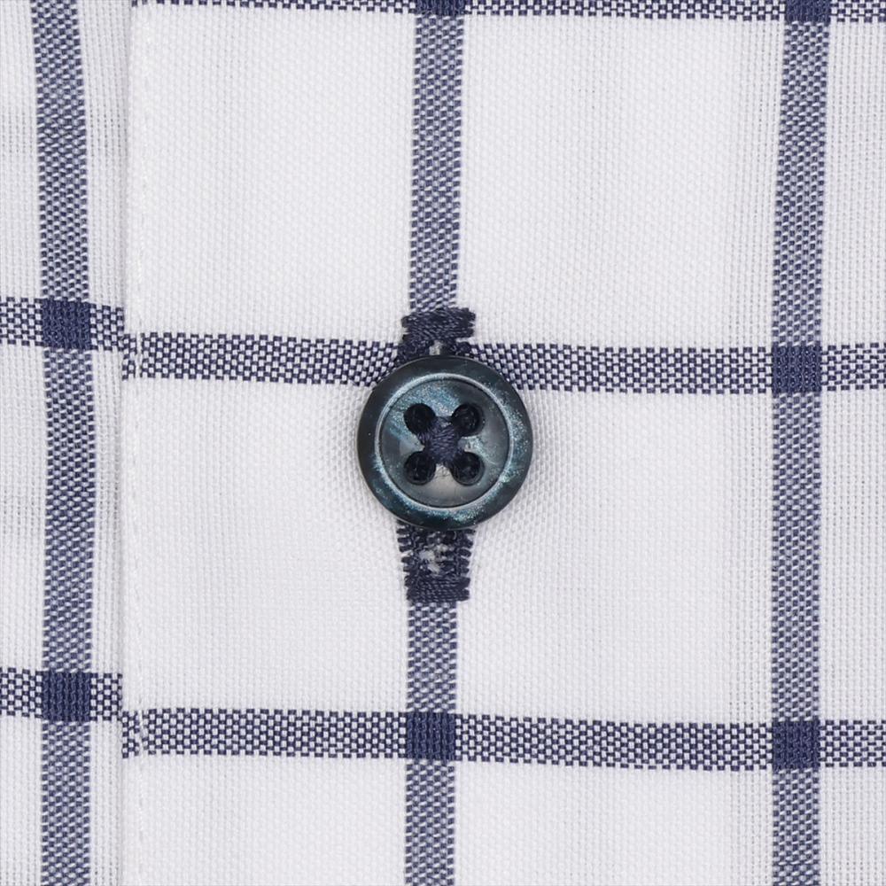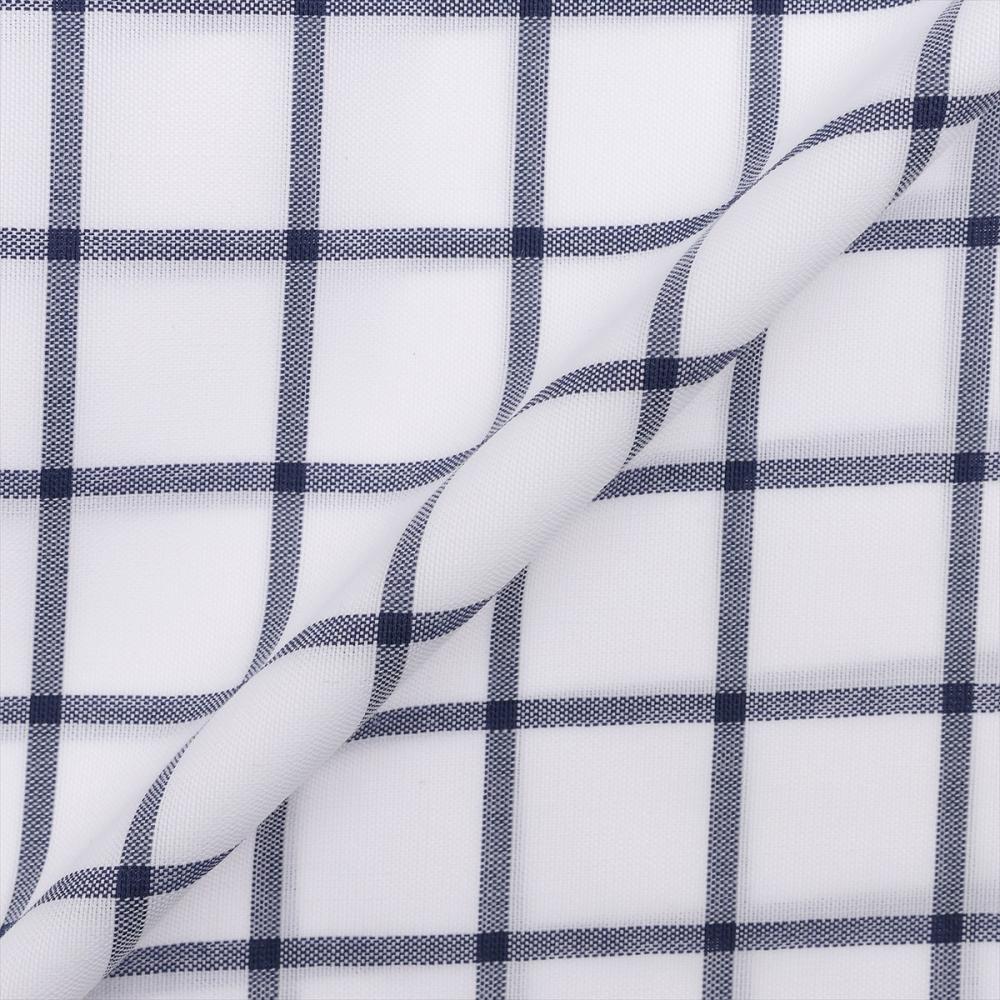存在感抜群なネイビーチェック生地に 台衿とカフス裏の別布使いに色ボタンを 同系色に統一しながらも、アクセントを 添えた一枚は個性ある衿元を演出します。