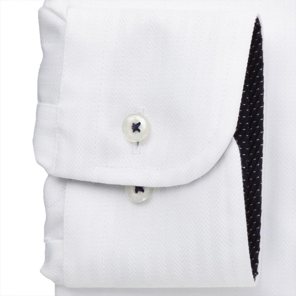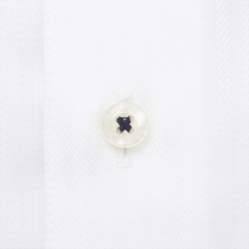 白ストライプ織の身生地に台衿と カフス裏の別布使いとボタン付け糸の ネイビー色糸がアクセントを加えてくれ、 個性ある衿元を演出してくれます。