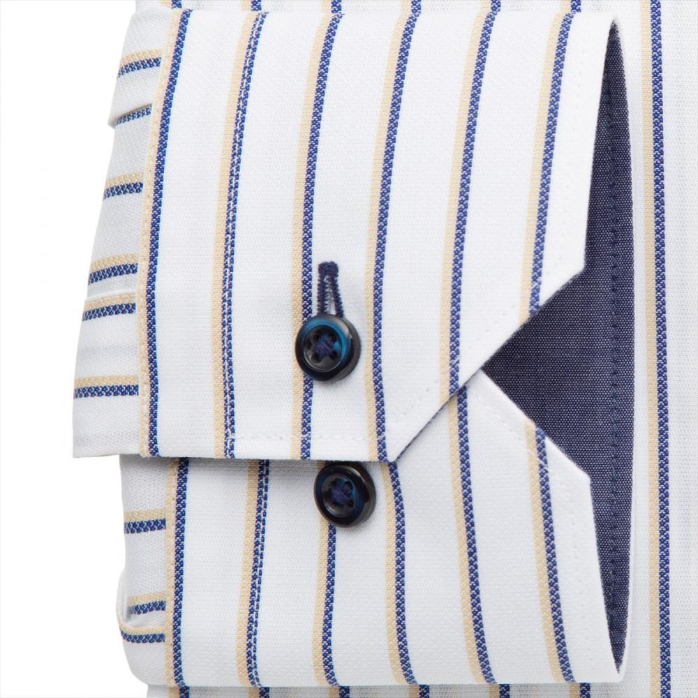 個性的なストライプ柄の身生地に 台衿とカフス裏の別布使いに色ボタンを 取り入れ、アクセントを添えた一枚。