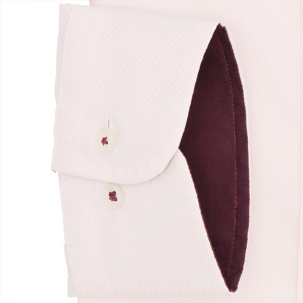 柔らかな雰囲気のピンク織柄生地に 台衿とカフス裏の別布使いとエンジ ボタン付け糸がアクセントを加えてくれ、 個性ある衿元を演出してくれます。