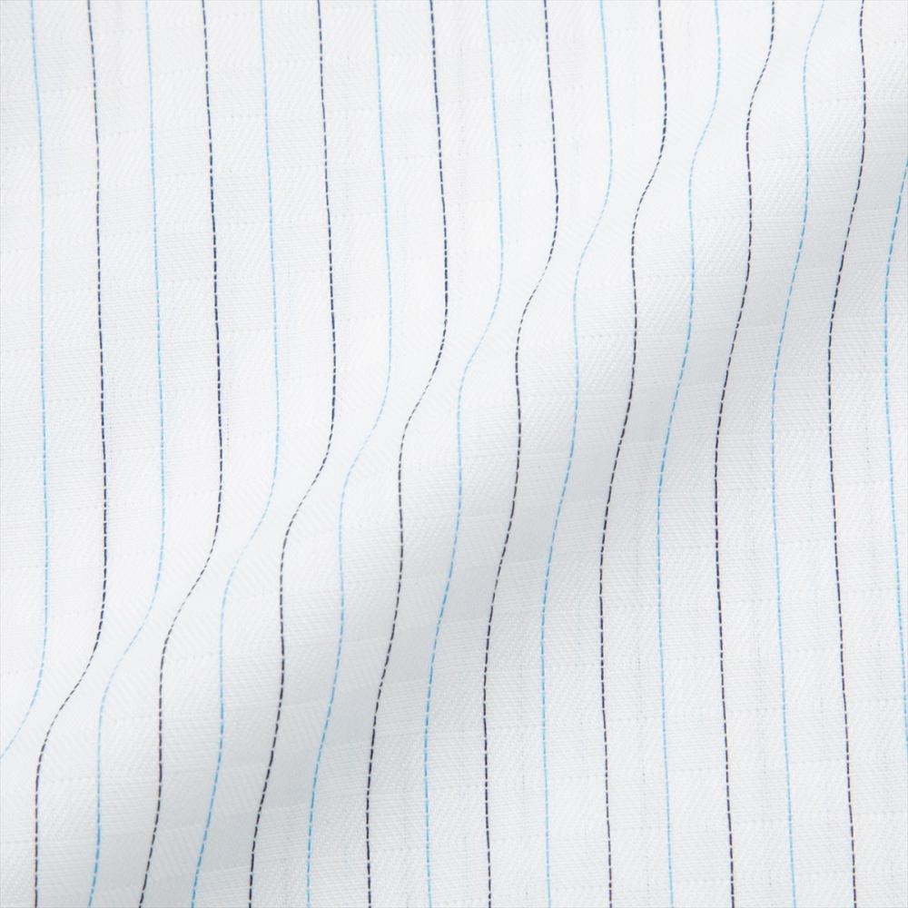 爽やかなストライプ柄の身生地に 台衿とカフス裏の別布使いにネイビー ボタン付け糸がさりげないアクセント。