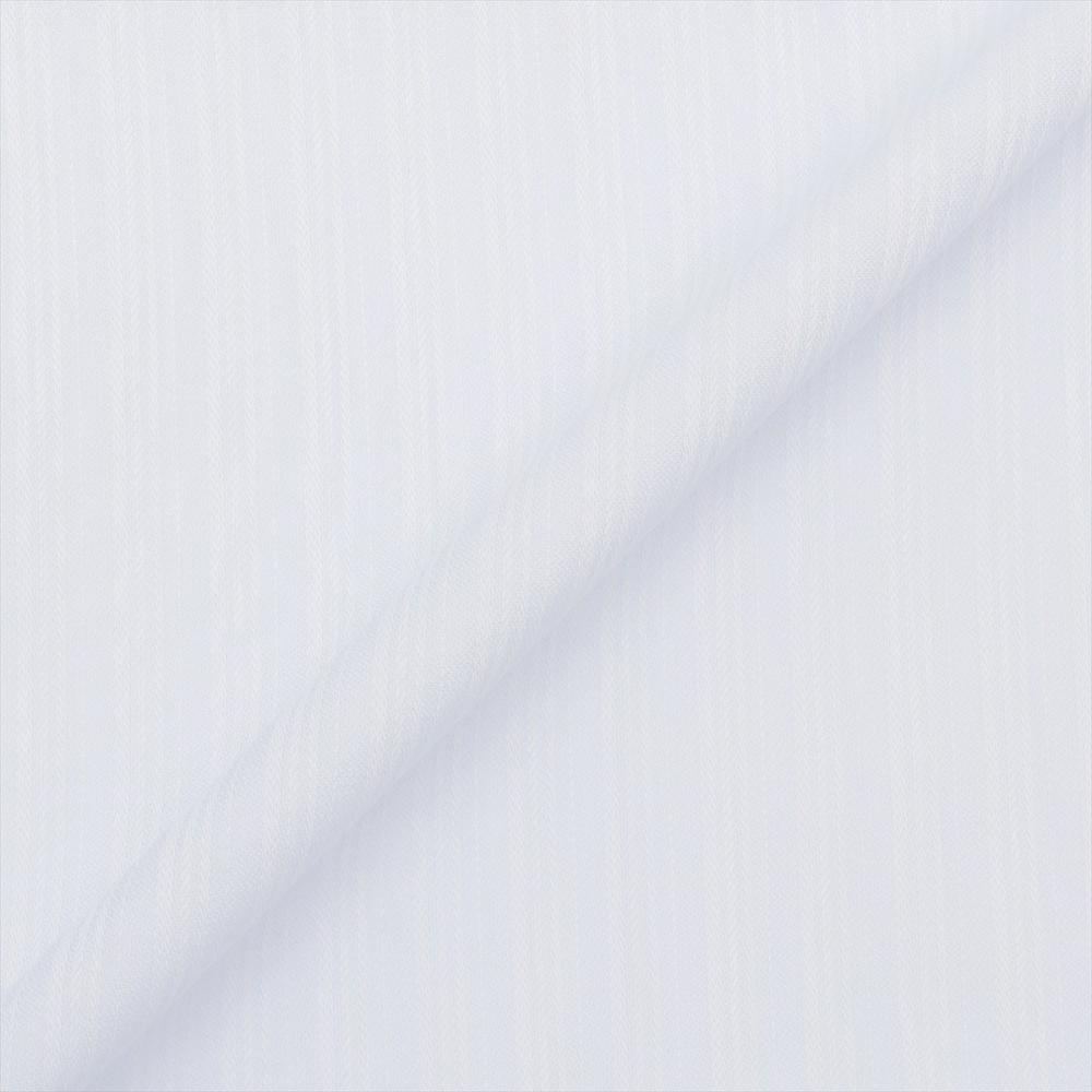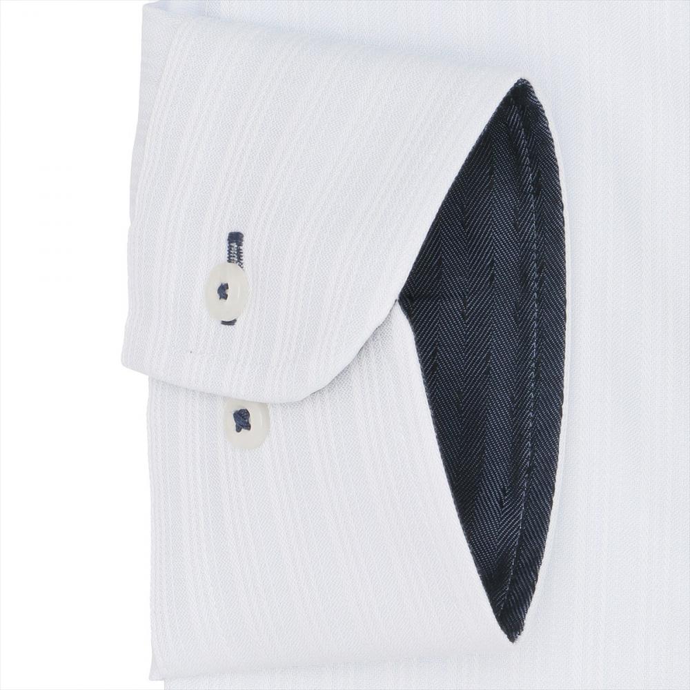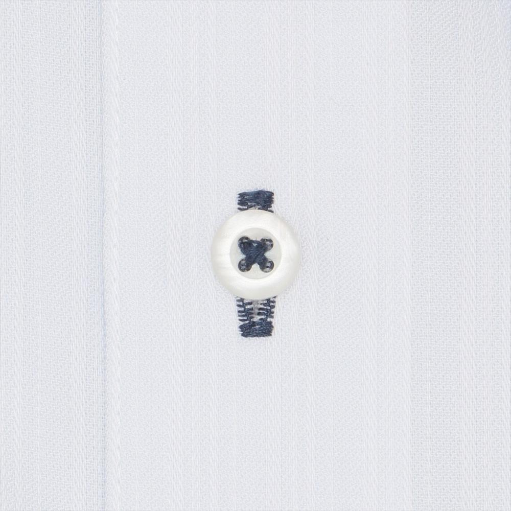 清潔感あるサックスストライプ織生地に 台衿とカフス裏の別布使いとネイビー ボタン付け糸がアクセントを加えてくれ、 個性ある衿元を演出してくれます。