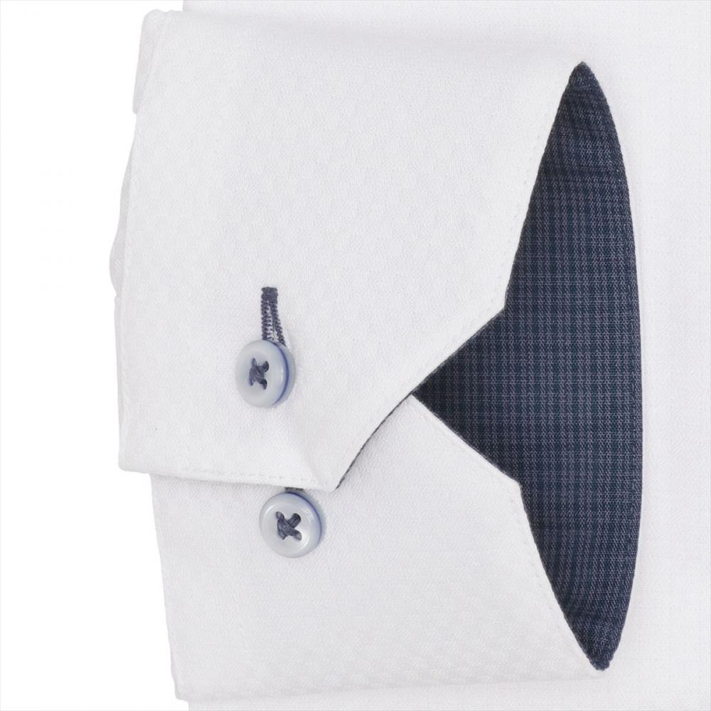 白の細かい市松格子織柄生地に 台衿とカフス裏の別布使いと三層ボタンを 同系色に統一しながらも、アクセントを 添えた一枚は個性ある衿元を演出します。