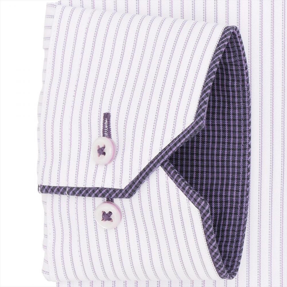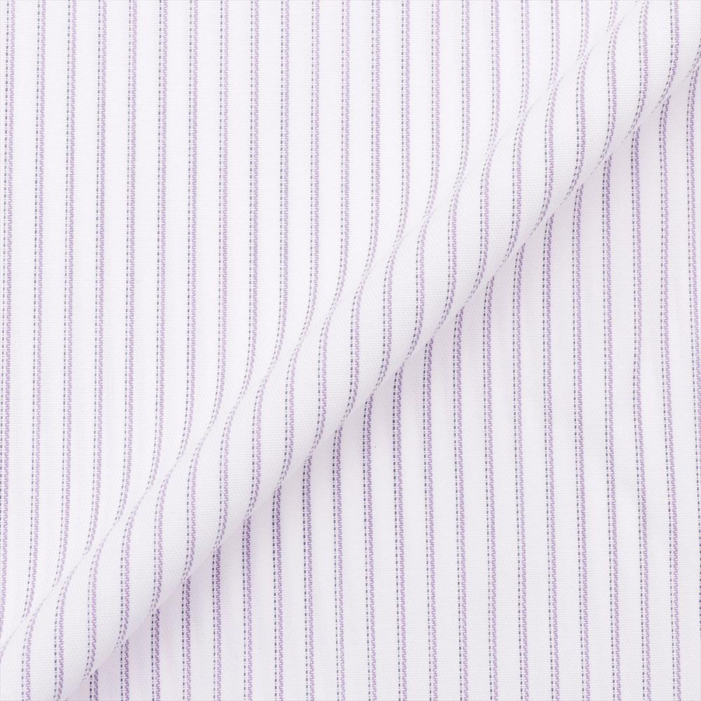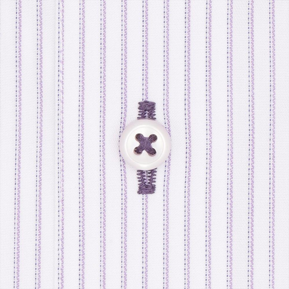 台衿とカフス裏の別布使いとパープルの ボタン付け糸や三層ボタンがアクセント。 個性ある衿元を演出してくれます。