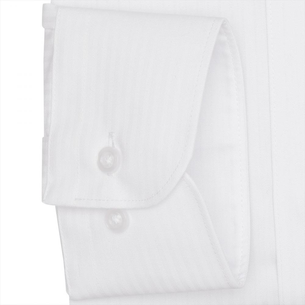 洒落感漂うストライプ織柄の白シャツ は、なじみやすくビジネスシーンで活躍 してくれ、ネクタイとの相性も◎です。