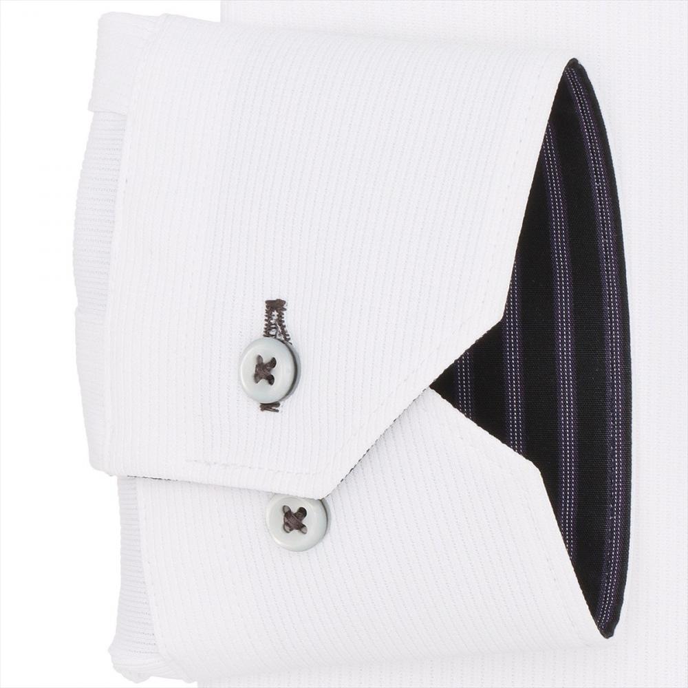 使いやすい白ストライプ織柄の生地に 台衿とカフス裏の別布使いが洒落感を 演出してくれ、汚れも目立ちにくく 一枚で着てもアクセントになるデザイン。