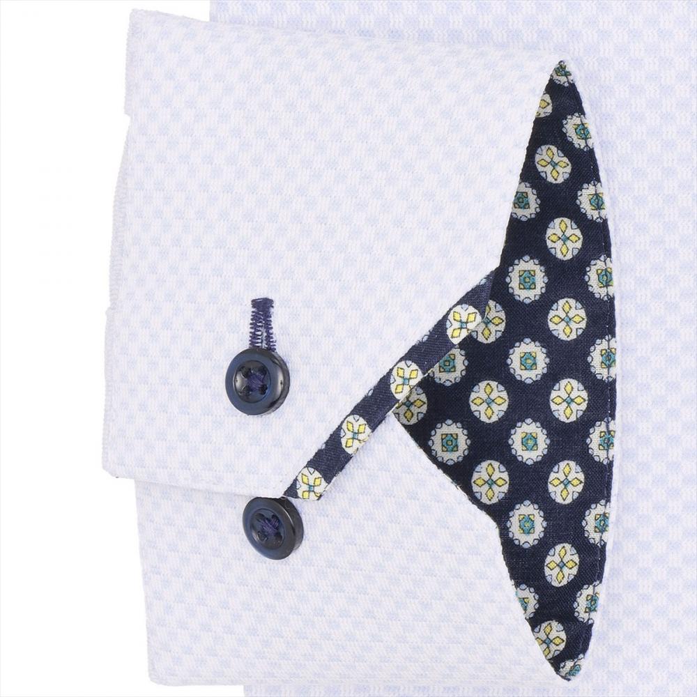 爽やかなサックス市松格子織柄の生地に 台衿とカフス裏の別布使いが洒落感を 演出してくれ、汚れも目立ちにくく 一枚で着てもアクセントになるデザイン。