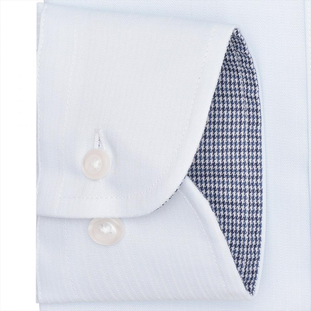 清潔感あるサックスストライプ織柄に 台衿とカフス裏の別布使いが洒落感を 演出してくれ、汚れも目立ちにくく 一枚で着てもアクセントになるデザイン。