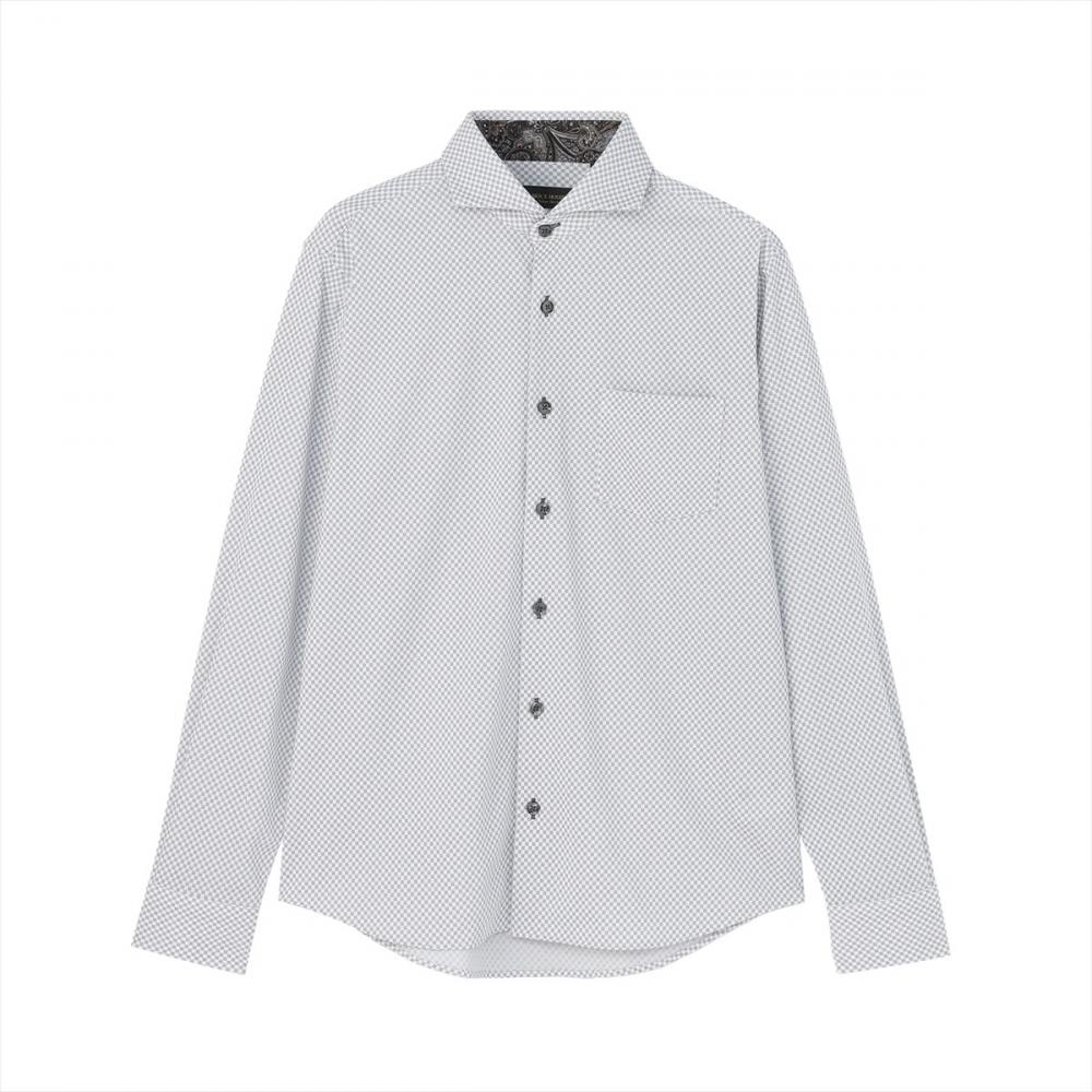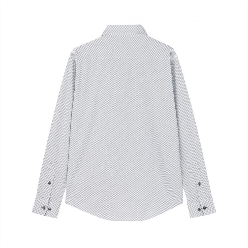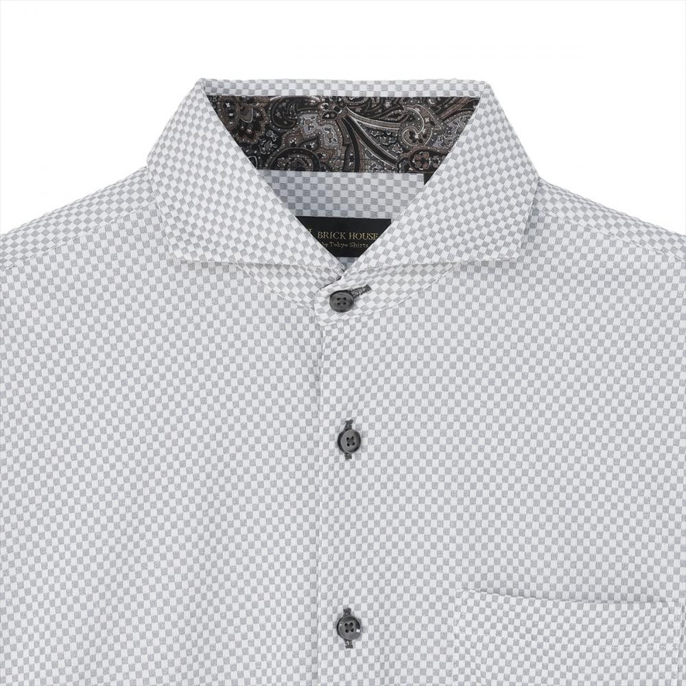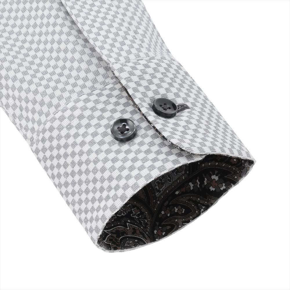 台衿内側とカフス裏にプリント別生地を 配してモード感を強調したデザインは すっきりしたシルエットで、タックイン・ アウトどちらでも洗練した雰囲気に。